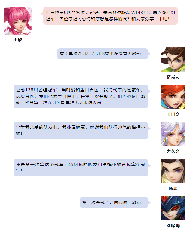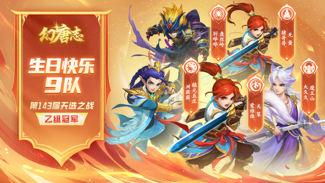 《幻唐志》本届天选之战各个分组的赛事已经圆满落下帷幕,首先让我们恭喜“生日快乐9队”一举摘下本届天选之战乙组的桂冠! 第143届天选之战乙组冠军 生日快乐9队 本次采访的团队成员有: 天策-1119五庄-洲霸霸无量-猪哥哥魔王-大久久盘丝-别哔哔 除此之外还有: 断鸿抹香小林台灯 最后,小欣还为大家带来了冠军队伍的大合影大家一起来看看吧~本届冠军采访到这里就结束了。祝愿大家在以后的赛事中都能取到好成绩! 欢迎在下方留言讨论,了解更多幻唐志的相关内容请关注 叶子猪幻唐志专区。 [编辑:ssc]