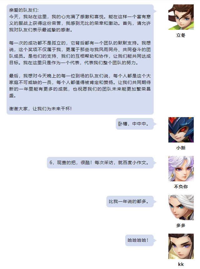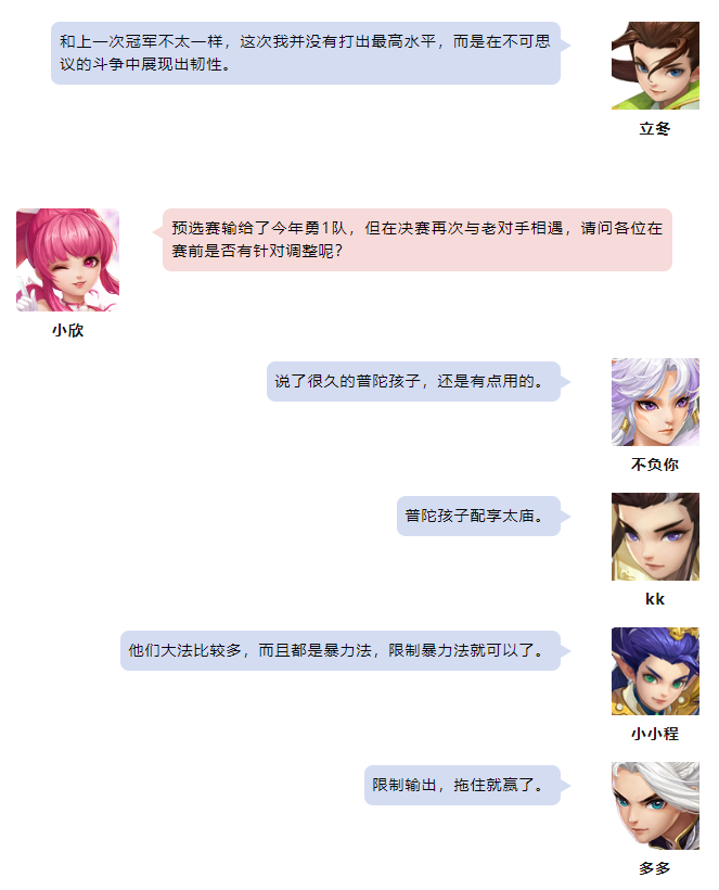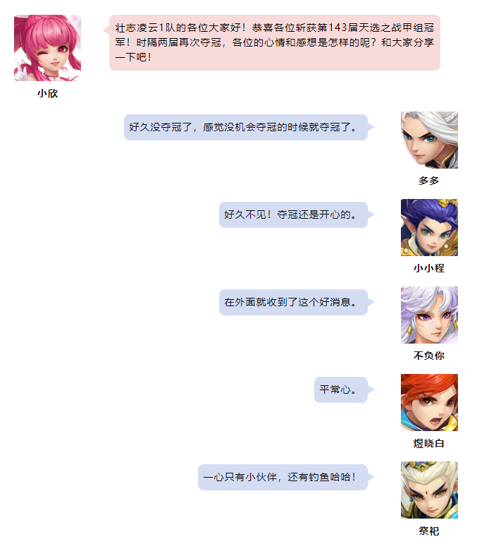 《幻唐志》本届天选之战各个分组的赛事已经圆满落下帷幕首先让我们恭喜“壮志凌云1队”一举摘下天选之战甲组的桂冠! 第143届天选之战甲组冠军 壮志凌云1队 本次采访的团队成员有: 话少难聊的五庄-小小程喜欢钓鱼呵小伙伴的五庄-祭祀每天都忙地见不到人的无量-煜晓白爱打羽毛球的魔王-不负你天策-立冬 除此之外还有: 多多刚好是你小新kk阿伟桃子 最后小欣还为大家带来了冠军队伍的大合影大家一起来看看吧~本届冠军采访到这里就结束了,祝愿大家在以后的赛事中都能取到好成绩! 欢迎在下方留言讨论,了解更多幻唐志的相关内容请关注 叶子猪幻唐志专区。 [编辑:ssc]