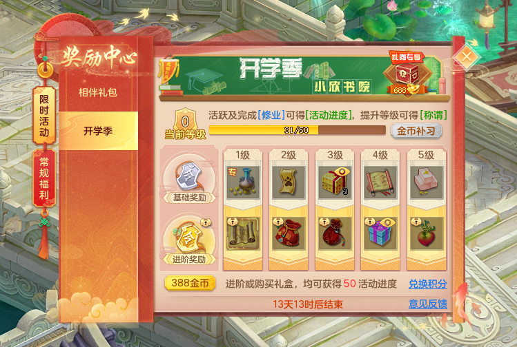 《幻唐志》开学季活动即将开启,活跃领好礼!第35届排位赛全明星本周开赛!先给大家梳理一下本周更新维护的核心内容。 【本周更新提纲】 开学季活动来袭 第35届排位赛全明星 钓鱼竞赛即将开启 新增成就勋章 其它内容调整 【开学季活动来袭】 (1)每日登录活跃及完成修业任务,可获得活动进度,提升活动等级可解锁对应奖励; (2)购买开学礼盒可立得聚宝盒、高级魔兽要诀等稀有奖励,还可领取开学礼祝福,参与日常活动时概率获得额外奖励; (3)维护后至9月5日,达到200活跃度时的幸运转转乐可额外获得点睛之笔,使用可获得随机奖励。 【第35届排位赛全明星开赛】 第35届排位赛全明星将于8月30日-9月1日进行,届时少侠可前往长安城武天处或打开赛事资讯界面观战,为支持的战队加油打气! 【钓鱼竞赛即将开启】 全新玩法钓鱼竞赛将在9月2日开启,少侠们在满足一定的评级和评分要求后即可在各地渔夫处选择参与。 慕子白每两周根据所有水域的记录之和结算,排名前10的少侠可以获得限时成就勋章和称谓奖励。 【新增成就勋章】 新增钓鱼竞赛、小伙伴演武、凌烟问剑的成就勋章,参与玩法获得全服排名将会获得对应玩法的成就勋章,感兴趣的少侠可以积极参与活动提升排名,通过勋章展现自己的实力! 【其它内容调整】 休闲钓鱼调整(1)每天11点、18点的鱼群事件调整为在两处水域同时刷出特殊珍稀鱼群与赛季鱼群,每天刷出的种类不重复,每人可钓一定次数,持续1小时;(2)对应提高了刷出特殊珍稀鱼群时特殊珍稀鱼的数量。 图鉴相关调整(1)专用图鉴碎片包增加九色鹿、龙虾骑士图鉴;(2)提高了使用千机碎片包合成变身卡时附加的属性下限;(3)招财礼券积分商店增加了专用图鉴碎片包和千机碎片包可兑换的数量。 其它调整(1)8月30日-9月12日,限时开启聚宝盒快速降妖除魔;(2)调整了每日及每周交易与赠予的现金额度;(3)调整了门派论剑勋章获得的条件。 *以上是慕子白带来的最新资讯* *最终效果可能会有所调整* 欢迎在下方留言讨论,了解更多幻唐志的相关内容请关注 叶子猪幻唐志专区。 [编辑:ssc]