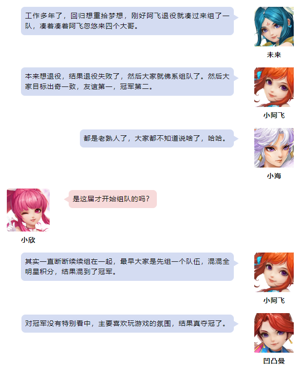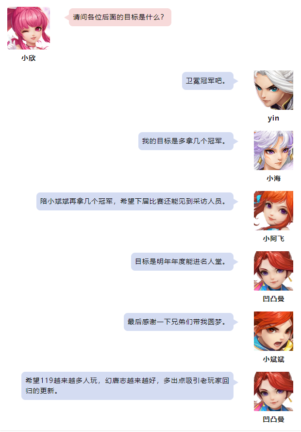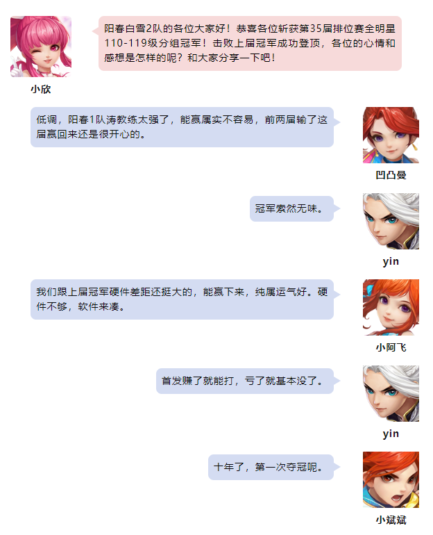 《幻唐志》第35届排位赛全明星各个分组的赛事已经圆满落下帷幕,首先让我们恭喜“阳春白雪2队”一举摘下本届110-119级分组的桂冠! 110-119级分组冠军 阳春白雪2队 本次采访的团队成员有: 南海普陀-未来 无量-小斌斌 天策-凹凸曼 魔王山-小海 七星方寸-小阿飞 除此之外还有: Yin 最后小欣还为大家带来了冠军队伍的大合影,大家一起来看看吧~本期冠军采访到这里就结束了,祝愿大家在以后的赛事中都能取到好成绩! 欢迎在下方留言讨论,了解更多幻唐志的相关内容请关注 叶子猪幻唐志专区。 [编辑:ssc]