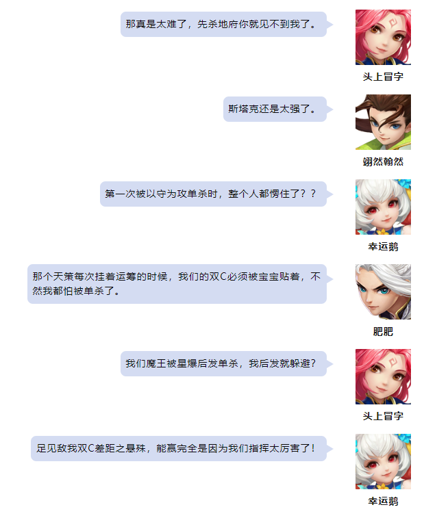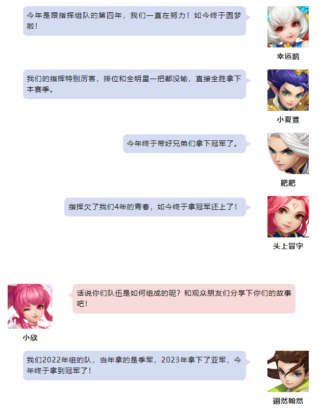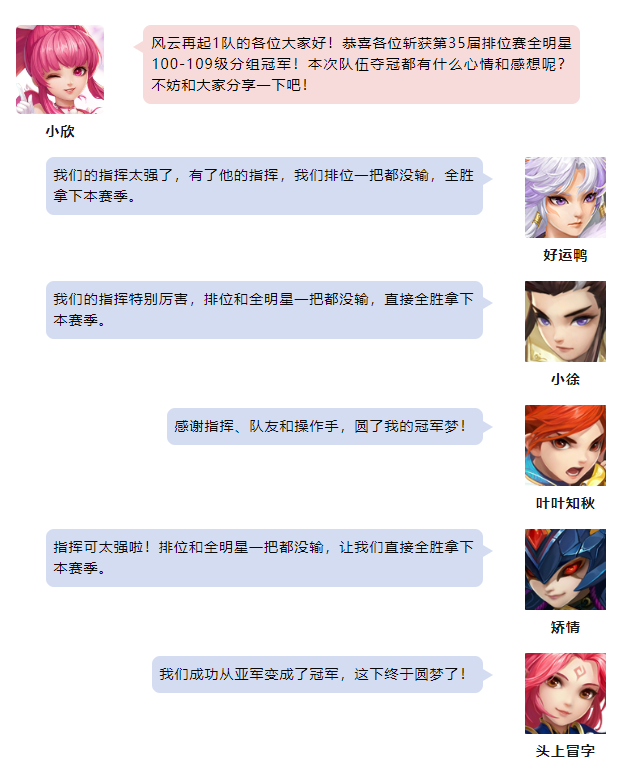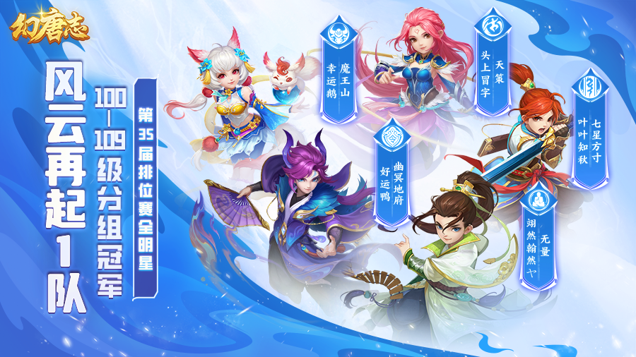 《幻唐志》第35届排位赛全明星100-109级分组冠军——风云再起1队,全胜拿下本赛季!来看看冠军采访实录吧! 100-109级分组冠军 风云再起1队 本次采访的团队成员有: 幽冥地府-好运鸭 七星方寸-叶叶知秋 魔王山-幸运鹅 天策-头上冒字 无量-翊然翰然 除此之外还有: 肥肥 小徐 小夏萱 矫情 最后小欣还为大家带来了冠军队伍的大合影大家一起来看看吧~本期冠军采访到这里就结束了,祝愿大家在以后的赛事中都能取到好成绩! 欢迎在下方留言讨论,了解更多幻唐志的相关内容请关注 叶子猪幻唐志专区。 [编辑:ssc]