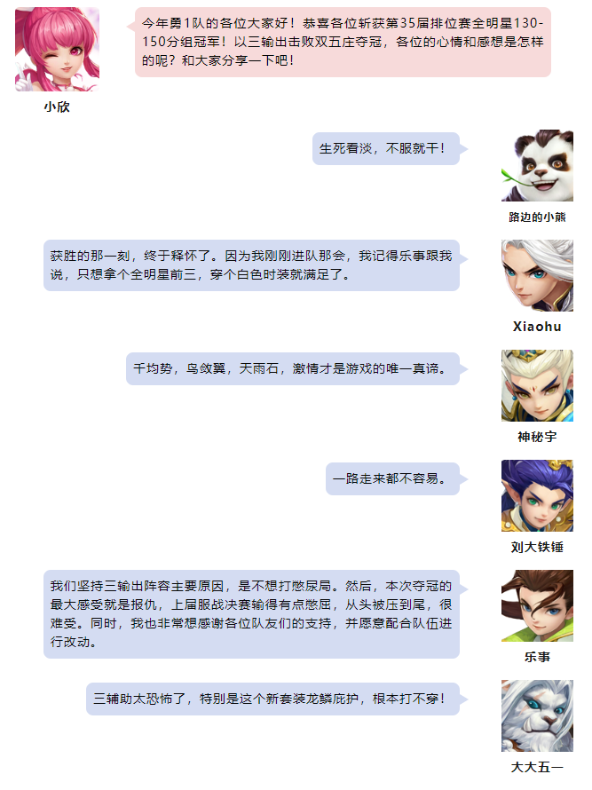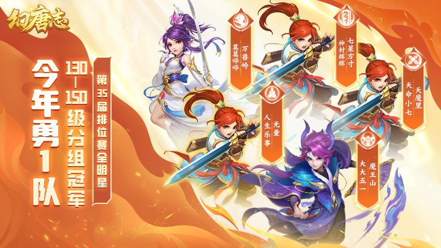 《幻唐志》第35届排位赛全明星各个分组的赛事已经圆满落下帷幕,首先让我们恭喜“今年勇1队”一举摘下本届130-150级分组的桂冠! 130-150级分组冠军 今年勇1队 本次采访的团队成员有: 七星方寸-神封辉辉 万兽岭-莫哔哔 无量-乐事 天魔里-天命小七 魔王山-大大五一 除此之外还有: Xiaohu 阿森 路边的小熊 刘大铁锤 小七的大跟班-胖莹 来自火星的神秘宇 吓鬼 最后小欣还为大家带来了冠军队伍的大合影,大家一起来看看吧~本期冠军采访到这里就结束了,祝愿大家在以后的赛事中都能取到好成绩! 欢迎在下方留言讨论,了解更多幻唐志的相关内容请关注 叶子猪幻唐志专区。 [编辑:ssc]