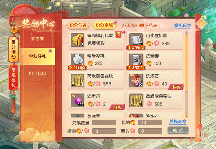 《幻唐志》本周维护更新,金秋月圆系列更多活动本周开启!宠物附魔属性上限提高,还有概率双附魔! 本周更新提纲 金秋月圆系列更多活动开启 庭院新增跑腿小狸 宠物附魔调整 其它内容调整 【金秋月圆系列活动开启】 中秋佳节将至,活动期间将开启以下活动: 1金秋好礼活动期间,每天登录、达到一定活跃度及参与限时活动可获得活跃积分,消费金币可获得返利积分,可在活动积分商城中兑换高级魔兽要诀、糯米凉糕等稀有奖励。 2百家月饼中秋将至,少侠可以通过帮助三界居民,获得月饼材料制作百家月饼,获得奖励的同时也能在游戏中体验中秋的氛围。 慕子白此外,许愿树皮肤“祈愿月兔”限时返场,还有中秋系列外观,拍卖中心限时加拍,有需要的小伙伴记得留意啦! 【庭院新增跑腿小狸】 少侠可以在庭院里雇佣跑腿小狸,有效期内无需再花费时间和现金购买物品来完成恩仇录。 慕子白高熟练度的小狸赠礼时还有额外好感加成,可以助少侠能更早一步与门派导师们的好感度达到生死之交。 【宠物附魔调整】 提高了宠物附魔的属性上限。当附魔属性值较好时,还有概率出现额外的附魔属性(双附魔); (2)庭院装饰新增金币购买的“观星仪”,使用观星仪附魔时可以提升出现额外属性的概率。 慕子白大家每天都可以借用好友的观星仪进行限量附魔(不会消耗持有者观星仪的耐久度),快去看看好友们谁购买了观星仪吧~ 【其它内容调整】 1官方助手支持更多功能(1)支持了武器点化功能;(2)支持了传器符、帮派活跃礼盒、帮派段位礼盒使用。 2其它调整(1)本周更新维护后至9月19日将开启小伙伴中秋活动,可在傲来国发现特殊小伙伴;(2)新增一种限时鱼类,维护后至9月19日可在渔夫处打听线索并前往钓得收藏;(3)钓鱼竞赛调整为不会钓得未知鱼类。 *以上是慕子白带来的最新资讯* *最终效果可能会有所调整* 欢迎在下方留言讨论,了解更多幻唐志的相关内容请关注 叶子猪幻唐志专区。 [编辑:ssc]