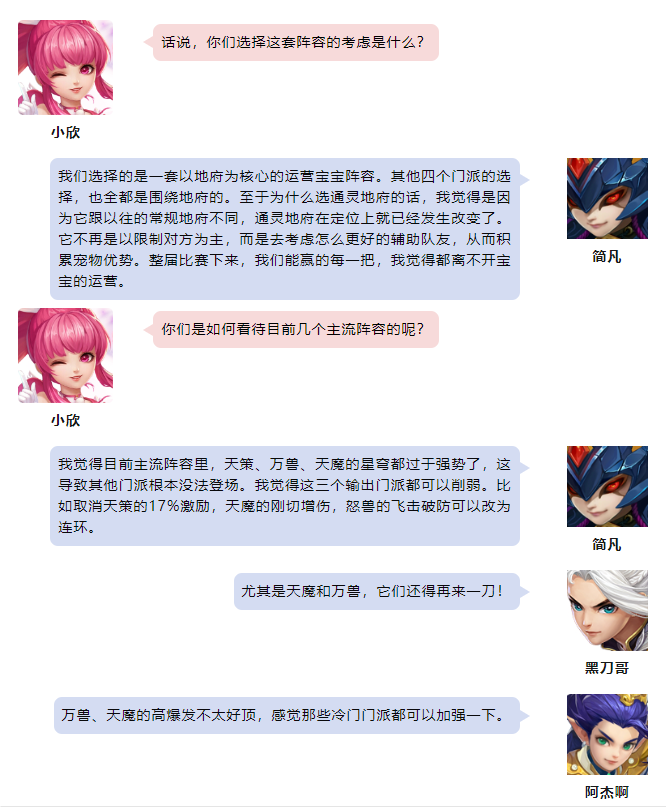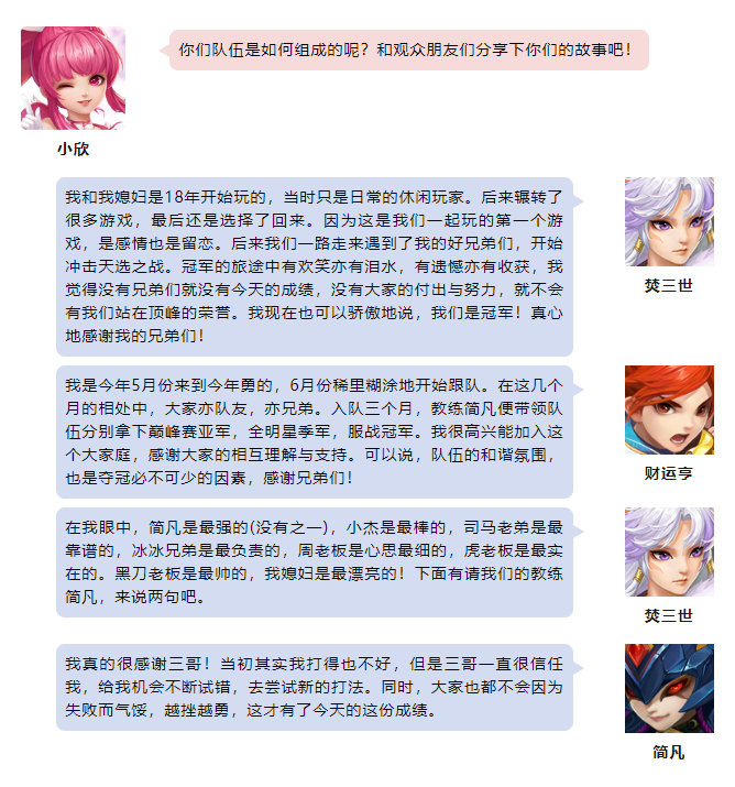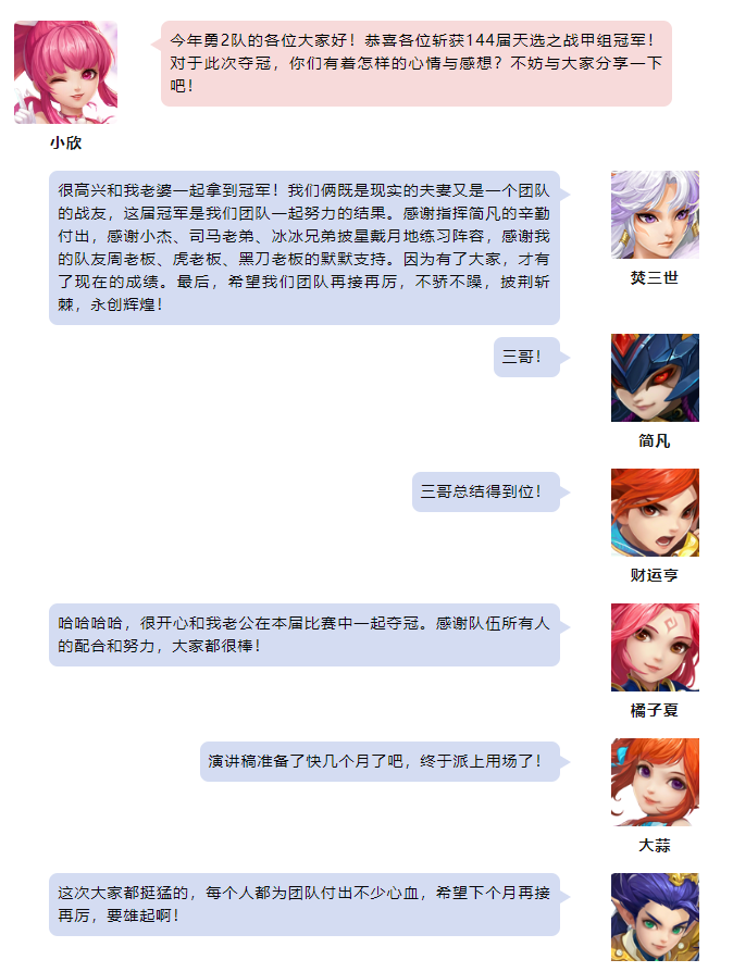 《幻唐志》本届天选之战各个分组的赛事已经圆满落下帷幕,首先让我们恭喜“今年勇2队”一举摘下本届天选之战甲组的桂冠!小欣邀请到了他们来接受冠军采访大家跟着小欣一起来了解一下吧! 第144届天选之战甲组冠军 今年勇2队 本次采访的团队成员有: 幽冥地府-焚三世天 魔里-财运亨 无量-大蒜 鬼谷-橘子夏 天策-黑刀哥 除此之外还有: 简凡 喜欢撒娇 阿杰啊 冰子 最后小欣还为大家带来了冠军队伍的大合影大家一起来看看吧~本届冠军采访到这里就结束了祝愿大家在以后的赛事中都能取到好成绩! 在这届比赛中一些顶尖选手凭借出色表现登上了各项数据统计的巅峰,让我们一起期待下届天选之战的到来见证更多激动人心的时刻! 欢迎在下方留言讨论,了解更多幻唐志的相关内容请关注 叶子猪幻唐志专区。 [编辑:ssc]