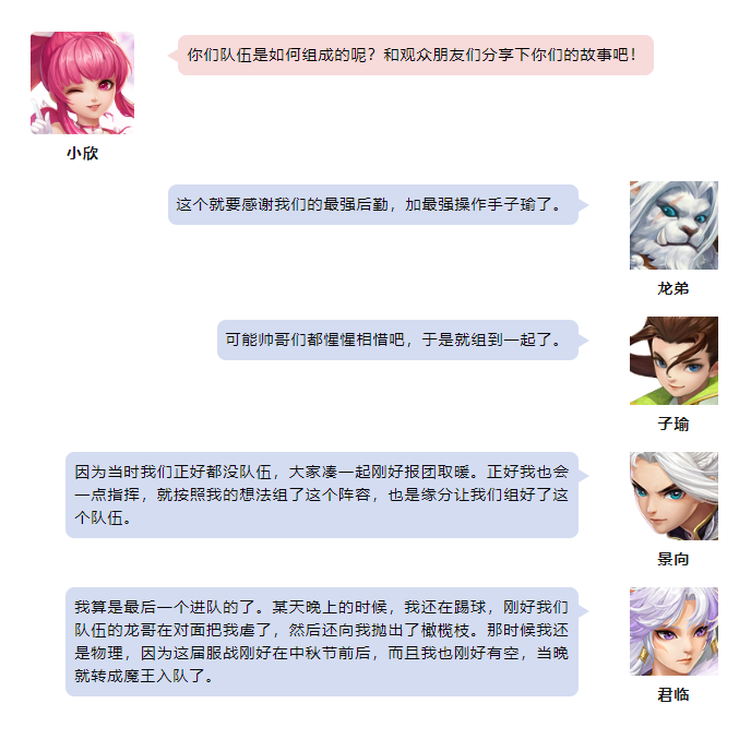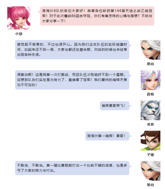 《幻唐志》本届天选之战各个分组的赛事已经圆满落下帷幕,首先让我们恭喜“浪淘沙8队”一举摘下本届天选之战乙组的桂冠!接下来我们一起来看下冠军采访吧! 第144届天选之战乙组冠军 浪淘沙8队 本次采访的团队成员有: 天策-景向(莫哔哔) 幽冥地府-龙弟(天翔) 魔王山-君临 七星方寸-子瑜 无量-许先生(许仙) 最后小欣还为大家带来了冠军队伍的大合影大家一起来看看吧~本届冠军采访到这里就结束了祝愿大家在以后的赛事中都能取到好成绩! 回顾比赛的经典瞬间冠军名人堂、各分组数据最佳个人等内容,感受比赛带来的激情和震撼,也让我们一起期待下届天选之战的到来! 欢迎在下方留言讨论,了解更多幻唐志的相关内容请关注 叶子猪幻唐志专区。 [编辑:ssc]