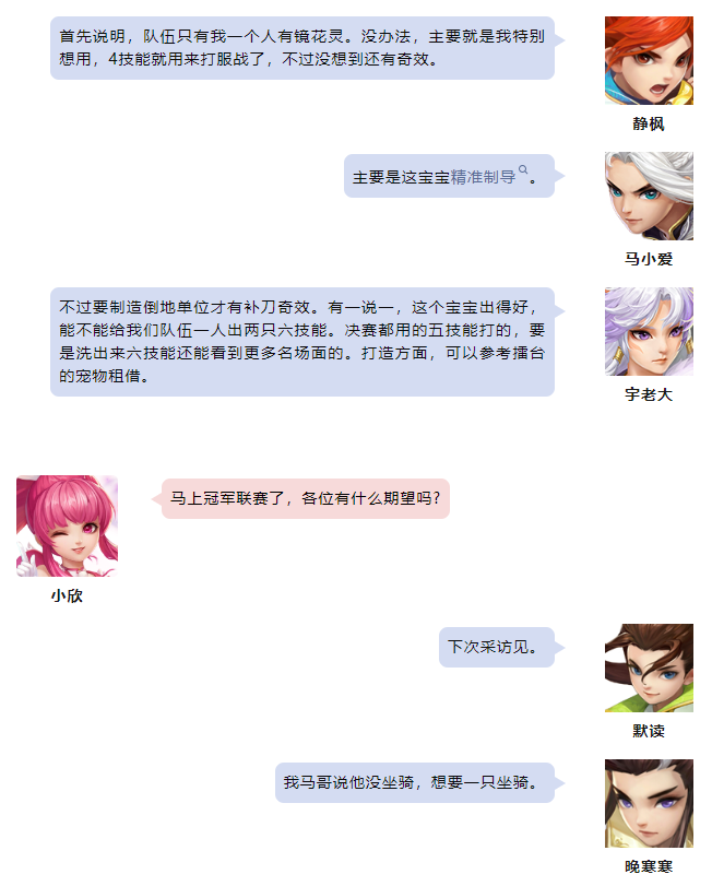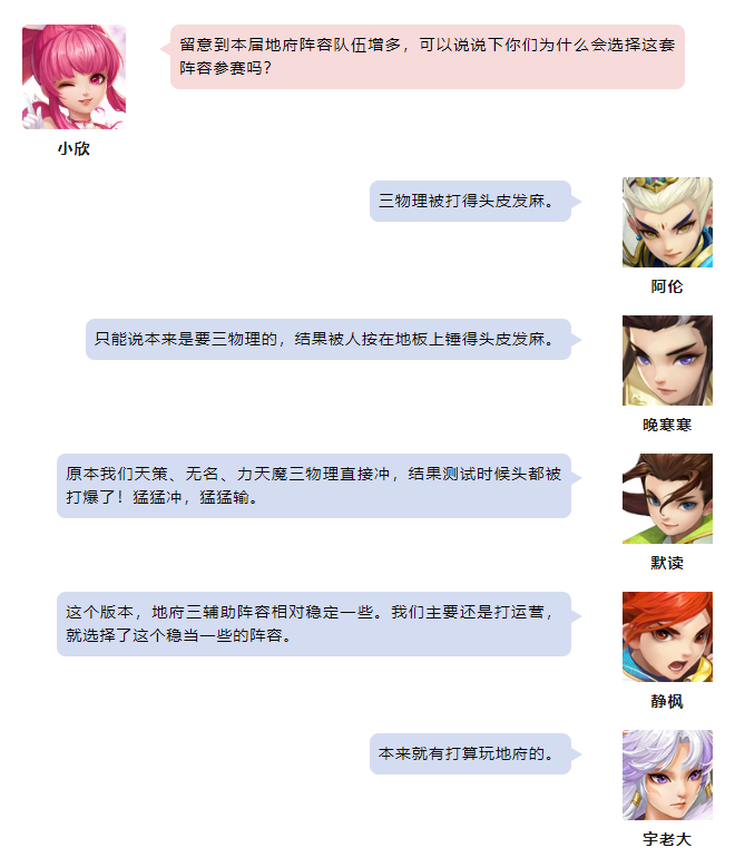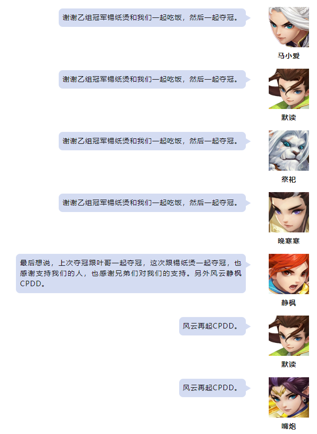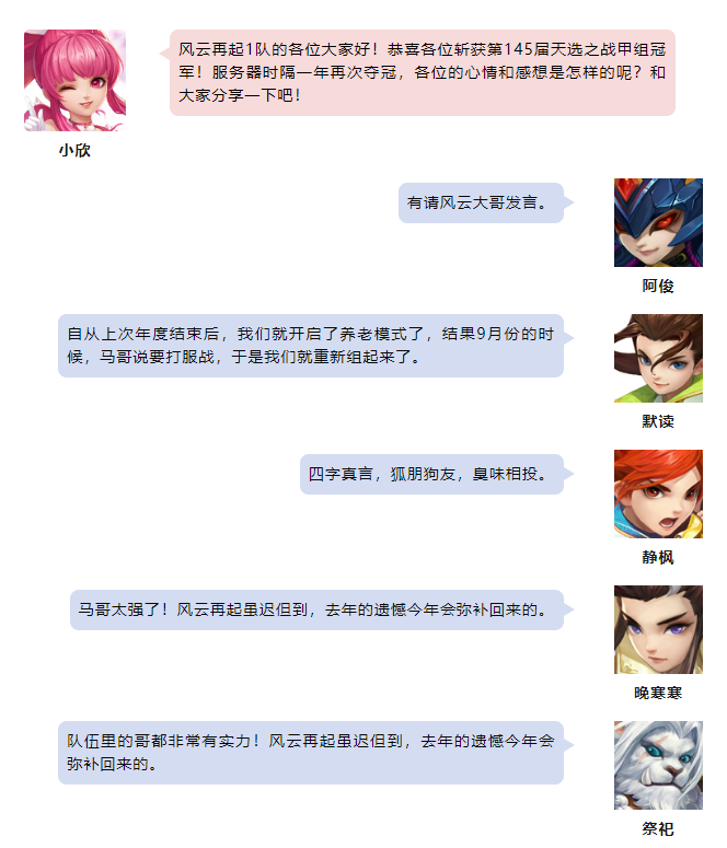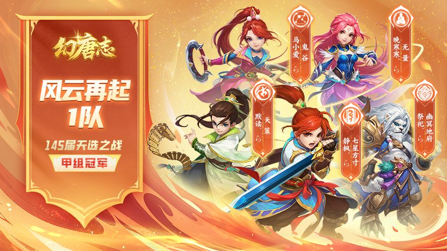 《幻唐志》本届天选之战各个分组的赛事已经圆满落下帷幕,首先让我们恭喜“风云再起1队”一举摘下本届天选之战甲组的桂冠! 第145届天选之战甲组冠军 风云再起1队 本次采访的团队成员有: 天策-默读、无量-晚寒寒、七星方寸-静枫、幽冥地府-祭祀、鬼谷-马小爱 除此之外还有: 阿俊、嘴炮、阿伦、温温、街角、灼灼、宇老大 欢迎在下方留言讨论,了解更多幻唐志的相关内容请关注 叶子猪幻唐志专区。 [编辑:ssc]