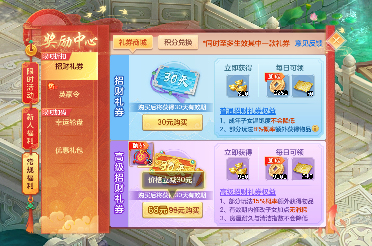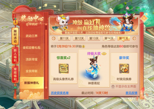 《幻唐志》烟火年年,长安常安!元宵系列服“长安常安”2月14日10点开启,不仅享受招财礼券加码,还有元宵新服“烟火年年”的新服福利,元宵系列活动等你体验! 系列服专属福利玩法 助力轻松畅玩 元宵系列服“长安常安”首张高级招财礼券不仅享30元优惠,每天银币收益还会提高25%。同时在系列服中完成副本玩法,还有额外福袋奖励。 第二天签到还可领取青瓷姬!它拥有可叠加伤害的特殊技能“碧海扬波”,还可解锁第五个技能栏,并在高级法术暴击和高级强壮中自选其一,是少侠初入三界时的首选群法战力。 系列服同享元宵新服福利 入驻元宵系列服“长安常安”,还可享在线抽神兽、打装备神通和易成长概率提高、萌宠试炼挑战等大服福利。冲级不仅能获得各种资源与福利,每晚还能参与在线抽奖,更有机会获取时装兑换券、陆地双人坐骑、神兽青蛇等大奖!除此之外,新服还有宗门试炼、招财礼券折扣、英豪令加码等诸多福利,助力少侠三界修行! 入驻还可免费领取强力单攻萌宠“雪翼蛇”!“雪翼蛇”的特殊技能不仅可以造成额外伤害,当技能触发必杀时,还会对目标额外进行一次普通攻击。少侠仅需日常活跃就能获取兽诀、元宵等养成资源,边玩边养成,不花钱也能打造强力萌宠。 元宵系列活动火热进行中 赏花灯,闹元宵!元宵系列活动带你喜迎新春!活动期间,少侠可通过日常活跃,参加彩灯结缘等元宵系列活动获得元宵积分,使用积分与信誉可兑换任意种类的元宵,助力少侠轻松打造强力宠物。此外,参与元宵彩灯活动,还有机会获得珍稀孔明灯、元宵积分等奖励。 旧服务器回归福利加码减负 回归原服务器的少侠可领取变异全高书限时宠物,累计活跃还可将限时宠物转为永久!不仅如此,回归任务周期还将缩短为7天,少侠每日仅需完成两项任务即可领取包括三界挑战令、神工符在内的多种珍稀道具。 武动三界活动再次开启,少侠在活动期间完成任务可获得活动进度,解锁比武积分加成、星穹点、护灵丹等奖励。 元宵系列服“长安常安”将于2月14日10点火热开启!不仅同步元宵新服专属福利还追加招财礼券! 欢迎在下方留言讨论,了解更多幻唐志的相关内容请关注 叶子猪幻唐志专区。 [编辑:ssc]