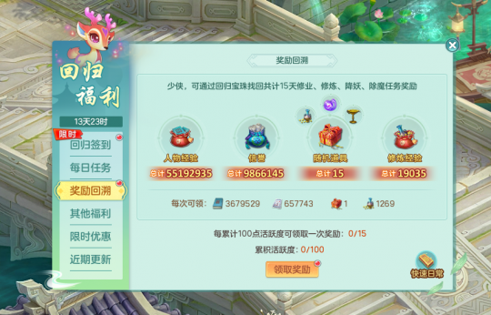 《幻唐志》为了迎接少侠回归老服,回归福利再度加码!上线签到即可自选带有神技神通的装备。回春、封锁、法术缭乱、崩山裂地,无论少侠来自什么门派,总有一款适合你!签到满7天还可将自选的紫色装备升级为宝石满锻的红色装备! 回归成长任务进一步减负,每日只需完成1项任务即可轻松领取全额奖励,可直接挑战生肖天罡的三界挑战令、强力萌宠鹿小淘、打造装备必出神技的神工符等你来领! 离开期间的玩法奖励也不容错过!鹿小淘帮忙找回了共计15天的修业、修炼、降妖和除魔玩法的奖励,少侠可以通过累计活跃领取。副本、生肖、天罡等其他日常玩法也可通过聚宝盒回溯奖励,回归少侠专享5折优惠! 除回归福利外,上线还可体验新角色洛清晚与全新玩法洛清晚赠礼,完成清单任务,获取拉风成就标签和丰厚奖励。 如果少侠选择入驻新服,则可享受大服专属福利。体验新角色洛清晚;次日签到领取全新强力群法萌宠“忘忧仙兔”,完成日常免费培养;每晚在线抽大奖,神兽青蛇、双人坐骑等一应俱全,下一个幸运儿说不定就是你! 恰逢五一前夕,三界中还有一系列精彩的五一活动与少侠们欢度假期,无论新服老服皆可参与。吉祥小铺送福运,聚惠好礼享不停;假期轻松领好礼,官方助手都可以;还有可一键完成领取奖励的聚宝券,假期出游也无忧! 欢迎在下方留言讨论,了解更多幻唐志的相关内容请关注 叶子猪幻唐志专区。 [编辑:ssc]