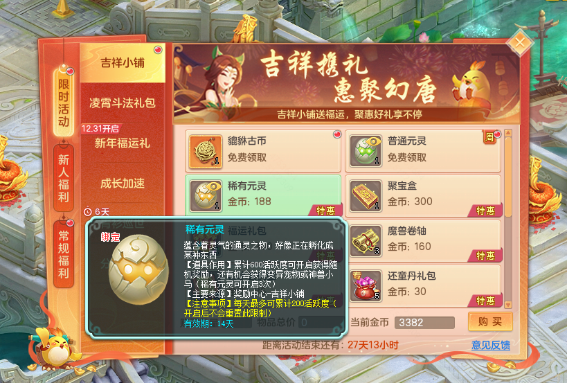 幻唐志元旦全新内容将于12月26日正式上线,每个服更有5只神兽龙马相送,更有龙马祈运、神瑞试炼吉祥小铺以及月卡特惠等一系列元旦福利活动,等待各位少侠前来体验! 领新年礼物新年倒数共迎2026 喜迎2026,上线领新年礼物。少侠日常活跃即可使用多个新年礼盒为帮派添加礼物,跨年夜晚上20点后即可前往帮派拾取新年礼物,不仅有机会获得神兽之灵、高级魔兽要诀等稀有奖励,还有概率获得神兽龙马礼包! 同时,少侠还可以约上三五好友一同在游戏中迎接2026,届时会在长安城、青河镇开启新年倒数,少侠可拾取新年福袋收获新年的喜悦。 少侠也可将新一年的祝福与期盼邮寄给未来的自己,开启一场跨越时光的对话! 马年神兽上线神兽福利送不停 吉祥小铺送福运,赢神兽龙马。少侠通过吉祥小铺可获得稀有元灵与免费的普通元灵,日常活跃即可开启元灵获得奖励,有机会赢取变异宠物或神兽龙马。 12月31日-1月4日期间,每个服连续5天每晚在线抽全新神兽龙马、双人坐骑以及时装兑换券等稀有奖励!参与龙马祈运活动,还有更多机会赢取新神兽龙马。 元旦系列活动同庆新年 少侠参与神瑞试炼,不仅可以获得首通礼盒、神兽龙马冰雕以及神兽龙马表情盲盒等奖励,还有概率获得神兽之灵等稀有道具奖励。 此外,少侠完成龙马赠礼任务,日常简单活跃还能领取7个龙马秘晶、多个神兽灵以及神兽内丹碎片等好礼。 更有高级月卡享立减30元优惠,并额外得3个龙马秘晶、琳琅秘宝抽全新战斗坐骑与全新武器外观等元旦福利活动,与各位少侠同庆新年。 元旦全新内容即将开启多种福利内容陪你欢度元旦数字大服“二〇二六”、全新角色全新萌宠、全新神兽等众多全新内容12月26日火爆上线! 欢迎在下方留言讨论,了解更多幻唐志的相关内容请关注 叶子猪幻唐志专区。 [编辑:ssc]
