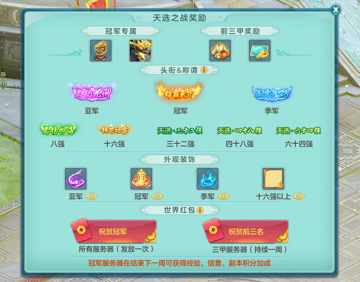 幻唐志数字大服“二〇二六”预创建已开启!现在预约开服即可领取好礼第159届天选之战冠军队伍诞生!天选之战赛事升级第160届将升级为?“天选之战争霸赛”各顶级战队巅峰对决!启明之战新增分组,奖励加码!众多精彩内容,诚邀少侠前往三界体验! 第159届天选之战冠军队伍诞生 第159届天选之战各分组赛事已圆满落幕,各分组冠军队伍荣耀加冕!恭喜风云再起1队(甲组)、三生万物11队(乙组)、二〇二四11队(丙组)斩获第159届天选之战分组冠军!后续我们将邀请冠军战队进行专访,敬请期待! 天选之战争霸赛来袭 风云际会,三界瞩目!第160届天选之战升级为?“天选之战争霸赛”,本届赛事所有分组队伍将同台竞技争夺桂冠。新增替补机制,少侠可组成9人队伍参加比赛,战术选择更加灵活。万众期待的决赛还将引入门派禁选,阵容策略再升级! 本届赛事新增资格赛阶段,将于12月29日开启报名,赛程同步延长一周。值得一提的是,进入选拔赛后,少侠队伍只要赢得一场比赛,即可返还报名费用。 此外,预选赛将调整为5场,每场获得的积分提升,少侠参与赛事可获得更多的积分奖励,但同时冲击淘汰赛的竞争也将更加激烈。而上届甲组16强队伍将直接锁定预选赛席位,静待挑战者!更令人振奋的是,象征荣誉的专属称谓、头衔等奖励,覆盖范围将扩展至64强,让更多奋战到底的队伍载誉而归。 启明之战调整 新服专属的启明之战将调整为与天选之战一样,每月开启一次,并新增天命组(120-130级服务器)、地灵组(100-115级服务器)、人杰组(85-95级服务器),让各等级段的服务器都有专属的分组比赛。 各分组前3名的队伍将获得专属称谓、头像、足迹、时装等多重奖励,冠军队伍还可额外获得“启明之戒”。第4至第16名的队伍将获得专属称谓和头衔。 数字大服“二〇二六”预创建已开启!使用全新角色“温知尘”创建角色,12月26日抢先体验全新战骑全新武器皮肤等一系列全新内容! 欢迎在下方留言讨论,了解更多幻唐志的相关内容请关注 叶子猪幻唐志专区。 [编辑:ssc]