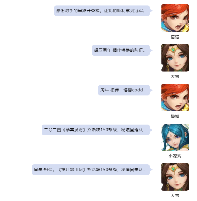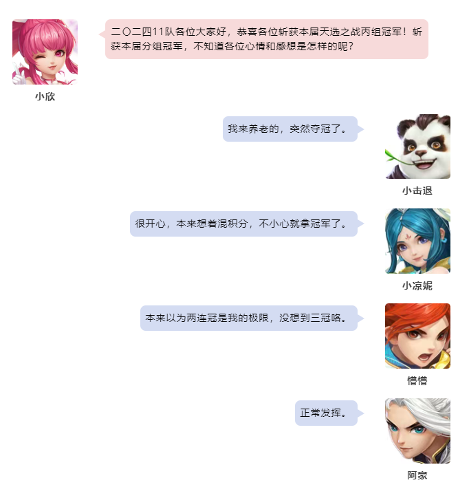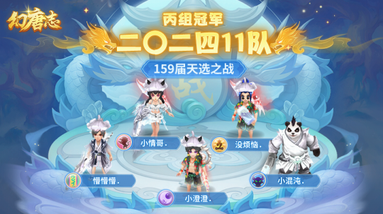 幻唐志冠军采访,第159届天选之战各个分组的赛事已经圆满落下帷幕,首先让我们恭喜“二〇二四11”队一举摘下本届丙组的桂冠! 第159届天选之战丙组 二〇二四11队 本次采访的团队成员有: 七星方寸-懵懵 万兽岭-小情哥 灵月山-小澄澄 无量-没烦恼 魔王山-小击退 除此之外还有: 阿豪 小凉妮 大雪 本届冠军采访到这里就结束了,祝愿大家在以后的赛事中都能取到好成绩! 欢迎在下方留言讨论,了解更多幻唐志的相关内容请关注 叶子猪幻唐志专区。 [编辑:ssc]