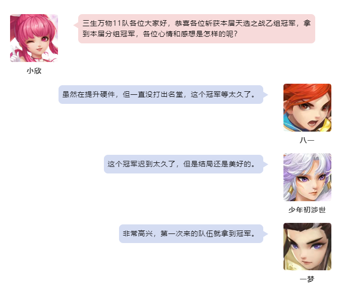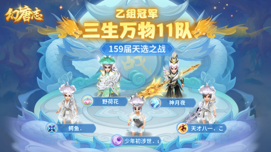 幻唐志冠军采访,第159届天选之战各个分组的赛事已经圆满落下帷幕,首先让我们恭喜“三生万物11”队一举摘下本届乙组的桂冠! 第159届天选之战乙组 三生万物11队 本次采访的团队成员有: 灵月山-少年初涉世 天魔里-鳄鱼 我是天策-八一 南海普陀-恩琦 东海龙宫-神月夜 除此之外还有: 一梦 悟空 猪脚饭 呜呜啦啦 本届冠军采访到这里就结束了,祝愿大家在以后的赛事中都能取到好成绩! 欢迎在下方留言讨论,了解更多幻唐志的相关内容请关注 叶子猪幻唐志专区。 [编辑:ssc]