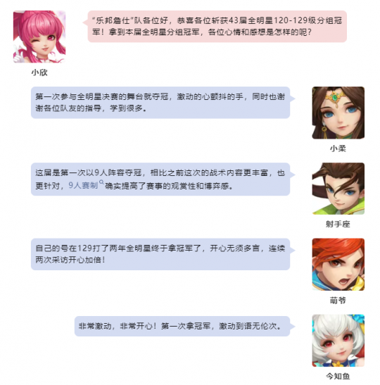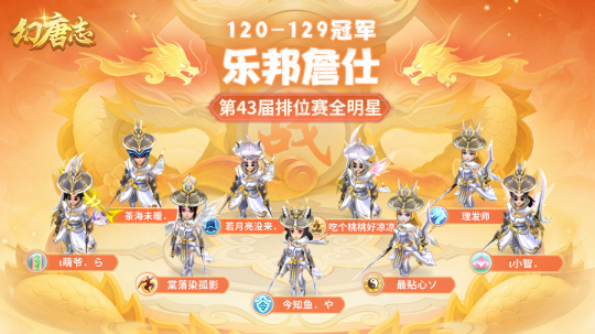 幻唐志第43届排位赛全明星,首先让我们恭喜“乐邦詹仕”队,一举摘下43届120-129级分组的桂冠! 120-129级分组 乐邦詹仕队 本次采访的团队成员有: 七星方寸-萌爷 镇元五庄、龙宫-射手座 幽冥地府-今知鱼 天策-阿靡 南海普陀-小智 灵月山-茶海 无名谷-月亮 无量-吃个桃桃 除此之外还有: 小柔 奶冻 最后小欣还为大家带来了冠军队伍的大合影,大家一起来看看吧~本届冠军采访到这里就结束了,祝愿大家在以后的赛事中都能取到好成绩! 欢迎在下方留言讨论,了解更多幻唐志的相关内容请关注 叶子猪幻唐志专区。 [编辑:ssc]
