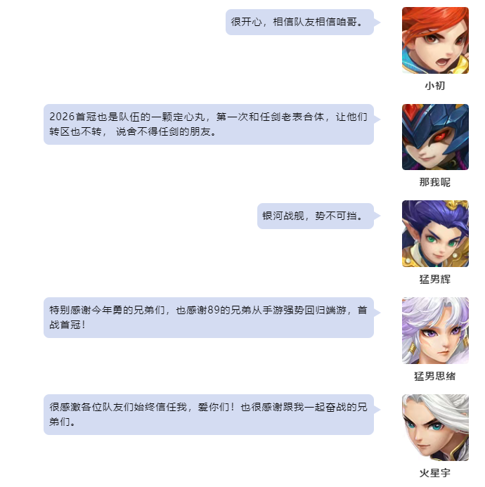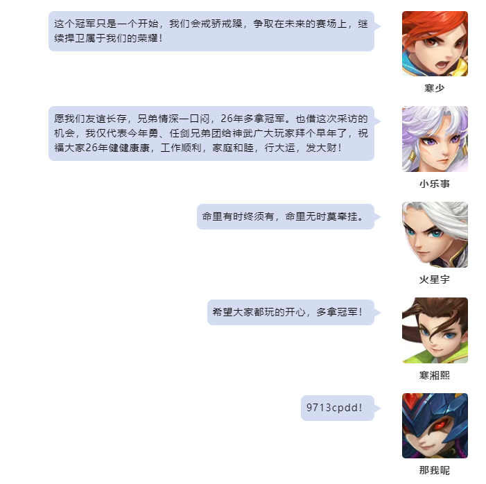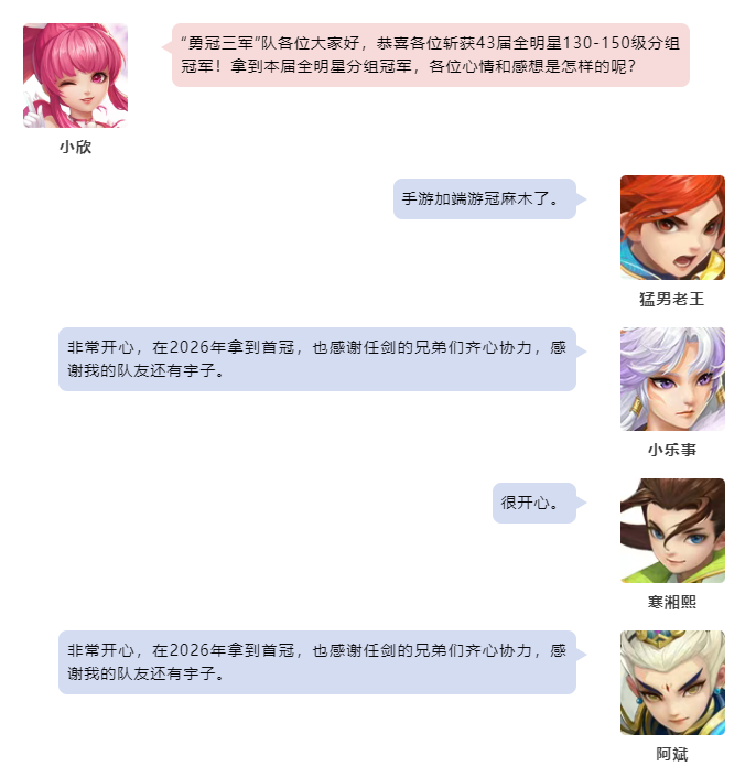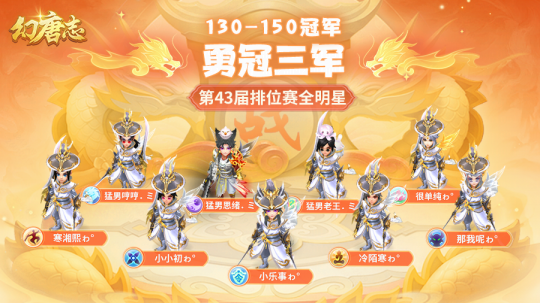 幻唐志第43届排位赛全明星各个分组的赛事已经圆满落下帷幕,首先让我们恭喜“勇冠三军”队一举摘下43届130-150级分组的桂冠! 130-150级分组 勇冠三军队 本次采访的团队成员有: 幽冥地府-小乐事 无量-寒少 天魔里-小初 魔王山-那我呢 天策-寒湘熙 南海普陀-阿斌 东海龙宫-猛男哼哼 七星方寸-猛男老王 灵月山-猛男思绪 除此之外还有: 火星宇 宝弟 立冬 山海神秘人 豪仔 彭新洪 小色 猛男辉 猛男泛仔 本届冠军采访到这里就结束了,祝愿大家在以后的赛事中都能取到好成绩! 欢迎在下方留言讨论,了解更多幻唐志的相关内容请关注 叶子猪幻唐志专区。 [编辑:ssc]