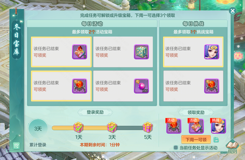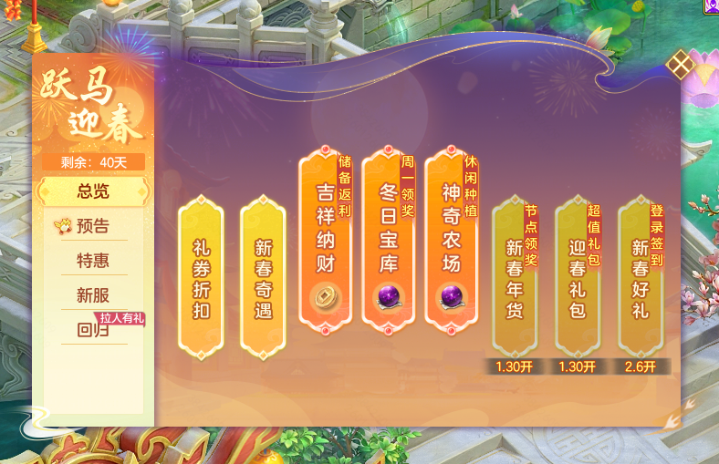 幻唐志今日活动:宝库上线领大奖,过关斩将赢神兽之灵与源生,冬日宝库火热进行中,今日上线即可自选丰富奖励,过关斩将活动今晚开启,组队闯关有机会赢神兽之灵与源生。 冬日宝库上线领奖 冬日宝库奖励现已开放领取,少侠可选择领取3个奖励。领奖后还将开启新一期宝库,累计多次完成活跃任务将有更多机会获得神兽之灵、神兽龙马礼包等珍稀奖励! 过关斩将闯关开宝箱 过关斩将活动将于今晚21:00开启!少侠们组队共同挑战导师幻影,成功闯关有机会赢取源生之灵、神兽之灵、高级魔兽要诀等稀有奖励!排名靠前的少侠还能获得称谓和勋章奖励! 天选之战报名开启 第161届天选之战今日正式开启报名,本届将继续升级为“天选之战争霸赛”。同时,本次赛事还将在资格赛新增比武积分奖励,直接晋级预选赛或首轮资格赛轮空的队伍,均可获得对应轮次的胜利奖励。想要参与的少侠千万不要错过! 海量活动迎新春 跃马迎春系列活动也已开启,吉祥纳财享活跃返利、高级月卡享立减30元优惠、醒狮系列外观限时返场以及限时奇遇“风雪夜归人”开放,多重福利活动期待各位少侠前来体验! 冬日宝库今日上线领奖,过关斩将赢神兽灵与源生等惊喜奖励,还有天选之战报名开启,海量福利活动与各位少侠一同迎新春! 欢迎在下方留言讨论,了解更多幻唐志的相关内容请关注 叶子猪幻唐志专区。 [编辑:ssc]