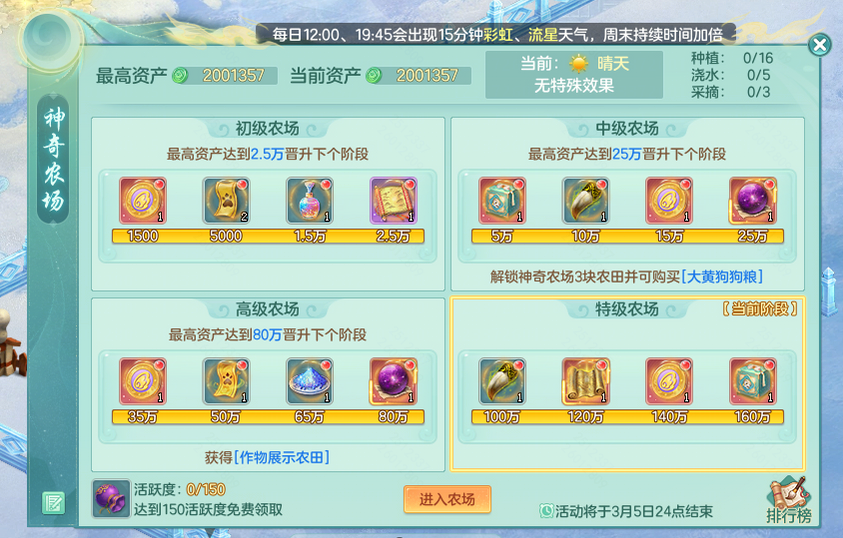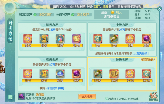 新一期农场开启? 奖励领取更轻松 本周维护后,新一期冰晶主题农场开启!少侠通过累计资产可领取2个神兽之灵、4个寻宝币等丰富好礼!值得一提的是,新一期农场的作物种子整体价格降低,且增加了更多倍率词条,使单株作物的价值上限更高!少侠累计资产拿奖励更轻松,快喊上好友一同体验种田乐趣吧! 全新冰晶地图 作物倍率突破1000+ 新地图、新作物、新玩法,各种全新内容1月30日同步上线!全新冰晶地图来袭,晶莹剔透的冰晶将布满整个农场,新增稀有度词条“冰晶”,单株作物的倍率上限将突破至1000+!快来种出你的高倍率作物吧! 全新作物掉落红包 8万银币等你领 2月12日神奇农场将会新增作物“摇钱树”,少侠每日晃动“摇钱树”可触发特殊天气,有概率为其他作物加上高倍率“富贵”词条。同时会掉落红包,拾取有机会获得88888银币,少侠也可前往他人农场拾取红包。 新作物“净灵根”也即将上线,其能在成熟时随机净化一块田地,若该田地存在作物则清除并使该作物免疫负面效果,助力少侠追求完美作物! 全新护院能手“大黄狗”来袭 辛苦养成的作物被采摘?看家护院“大黄狗”来帮忙!新一期农场少侠可喂养“大黄狗”,它不仅能陪伴少侠种植作物,还能在少侠离开时看家护院,降低作物被采摘的概率。若采摘失败,大黄狗会咬下对方的神奇币并留下记录,是陪伴少侠畅玩农场的好帮手! 幸运星期三挖宝藏 桃源仙踪如约开启,今晚19:00探宝寻好礼!在幸运星期三的加持下,少侠能使用失修宝藏铲的挖掘多少次?今晚一试便知!参与活动有机会获得三级护符重置丹、神兽之灵等丰富奖励,幸运宝藏不容错过! 欢迎在下方留言讨论,了解更多幻唐志的相关内容请关注 叶子猪幻唐志专区。 [编辑:ssc]