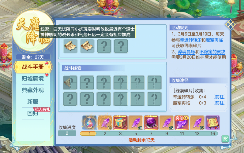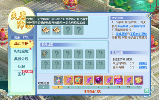 本周更新提纲 1. 战斗手册活动开启 2.魔军再临三界 3. 长安街市开启 4. 多项赛事进行中 5. 新服“万灵封魔”即将开启预创建 6. 其它内容调整 【战斗手册活动开启】 (1)3月6日至3月19日,少侠参与“战斗手册”玩法,日常活跃可收集线索碎片,集齐碎片即可解锁宠物突破、战斗调整等新内容线索信息; (2)解锁一定数量的线索还可领取神兽之灵、鸿运宝箱、淬魂晶砾等进度奖励。 (3)3月20日后淬魂晶砾可用于兑换洗炼石或宠物突破洗炼次数,宠物突破后有机会获得新的兽诀加成技能! 最近双儿在切磋中输给了虎子十分不服气,听说是缥缈符状态下被攻击导致效果降低所致~ 【魔军再临三界】 (1)近期,域外霜原出现大批魔军怪物游荡,集结于寒渊城外蠢蠢欲动,预谋着对三界发起新一轮入侵; (2)维护后每日9:00-23:00少侠们可前往域外霜原,击败魔军有机会获得虹彩、神兽之灵以及粗糙的晶核等奖励。 粗糙的晶核可在长安城温知尘处兑换为淬魂晶砾~ 【长安街市开启】 维护后长安城(167,170)将举办街市,各式商贩叫卖声不绝于耳,水果商李大壮也在其中。少侠们可与其对话购买储备经验果等食品,是快速获取经验的好时机! 【多项赛事进行中】 第162届天选之战 (1)天选之战争霸赛将于3月6日进行选拔赛,3月7日进行资格赛,祝参赛的选手们可以取得好成绩; (2)天选之战争霸赛晋级预选赛的名额调整为96个队伍,由资格赛前80名及前一届天选之战前16名的队伍组成。 启明之战 (1)3月6日维护后开启报名,服务器等级在85-130级的服务器可参与,全队角色等级均高于服务器等级即可报名参与; (2)3月14日进行预选赛,通过4轮战斗确定晋级名单,3月15日进行淘汰赛,各服务器分组角逐最终冠军。 【春季大服“万灵封魔”即将开启预创建】 春季大服“万灵封魔”将于3月9日9:30开启预创建! (1)新服有全新萌宠“墩墩熊”伴少侠们同行;经典65级宠物龙女迎来技能迭代,新服专享100次免费洗宠次数。还有礼券优惠、琳琅秘宝等福利活动期待少侠们进入游戏内了解。 (2)2月14日后未登录过账号的少侠,前往新服创角将激活回归专属叶子特权,享时空秘境等叶子专属福利。 【其它内容调整】 (1)跃马迎春礼包提前至3月19日下架; (2)2月14日后未登录过游戏的账号,回归可激活春季回流福利; (3)支持花费一定代价在仓库管理员处找回维护后未保存的满数值符石洗炼属性; (4)支持在不同商城内关注神兽内丹碎片。 *以上是慕子白带来的最新资讯* *最终效果可能会有所调整* 欢迎在下方留言讨论,了解更多幻唐志的相关内容请关注 叶子猪幻唐志专区。 [编辑:ssc]