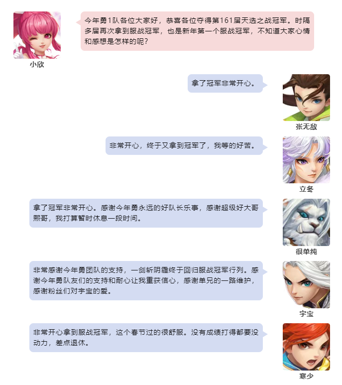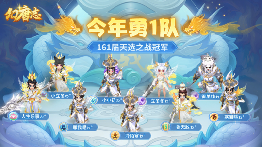 幻唐志冠军采访:时隔十个月再度登顶!第161届天选之战各个分组的赛事已经圆满落下帷幕,首先让我们恭喜“今年勇1”队一举摘下本届桂冠。 今年勇1队 本次采访的团队成员有: 张无敌 立冬 寒少 小小初 乐事 寒湘熙 很单纯 那我呢 除此之外还有: 宇宝 最后小欣还为大家带来了冠军队伍的大合影大家一起来看看吧~ 欢迎在下方留言讨论,了解更多幻唐志的相关内容请关注 叶子猪幻唐志专区。 [编辑:ssc]