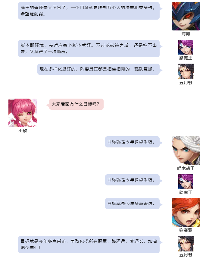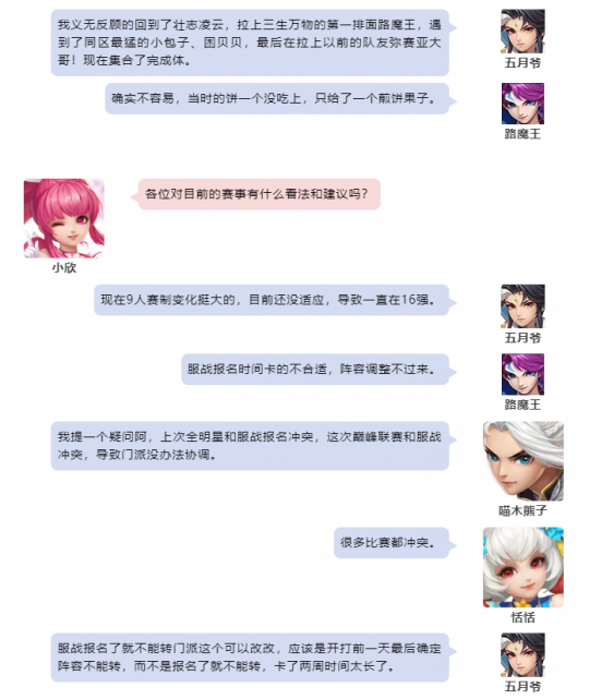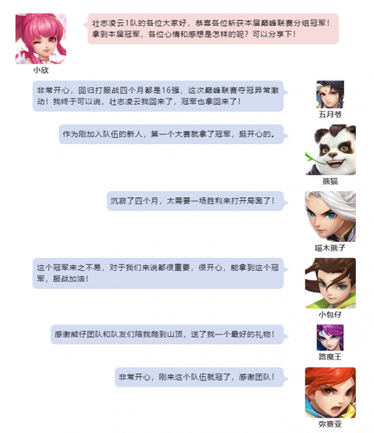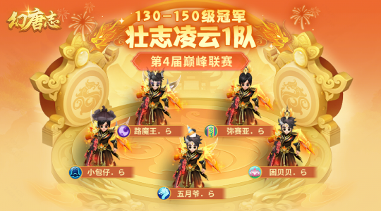 幻唐志冠军采访:第4届巅峰联赛各个分组的赛事,恭喜“壮志凌云1”队一举摘下本届130-150级分组的桂冠! 130-150级分组 壮志凌云1队 本次采访团队成员有: 五月爷 路魔王 弥赛亚 小包仔 困贝贝 除此之外还有: 喵木熊子 海海 辰辉 恬恬 熊猫 糖糖 本届冠军采访到这里就束了,祝愿大家在以后的赛事中都能取到好成绩! 欢迎在下方留言讨论,了解更多幻唐志的相关内容请关注 叶子猪幻唐志专区。 [编辑:ssc]