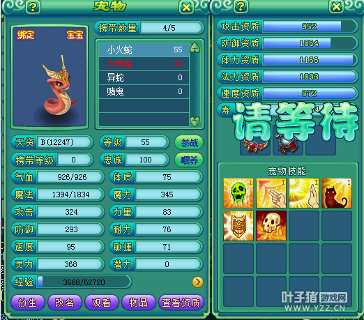 相关资讯: 再来看看官方介绍炼妖特点,有几个我们要特别注意。 一、炼妖后是不能找回的(为何放第一,等下有介绍) 二、最多8技能哦,所以如果有12技能宝宝,那绝对是假的,因为加护肤才10个技能哦! 三、小葫芦、吉祥、小妈咪、小萝莉都是可以炼妖的,但是,大波和罗成是不能的,珍兽神兽也是不能。 附一张LZ下午的炼妖成果图。 就是这条蛇了,书是后来LZ打上去的。。
