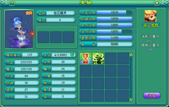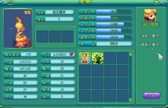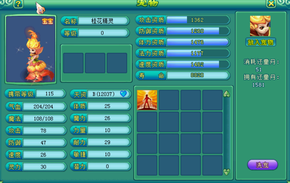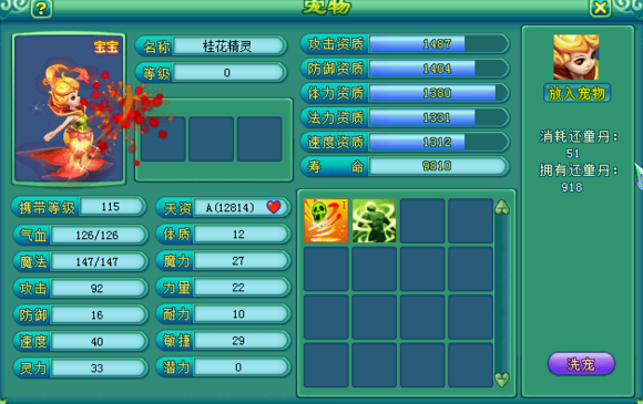 相关资讯: 2193丹决战115宝宝。大家说洗桂花好呢?还是桂花好呢?好难选择,还是洗桂花吧。 苦存多年的弹药,2193,不多也不少,能洗出一只能看的我就心满意足了。 直播桂花,一次就要51个丹,大概能洗40几次,要是出个变异的话就更加要更加多丹了,现在就感觉有点虚了,怎么办。 相关资讯: 攻资1587!可惜那成长是蓝的。 相关资讯: 果然成长蓝着蓝着就绿了,丹也快一半了,洗了10几次还是没有变异。 这次还不错,紫色成长,先放着换一只洗,我没钱不是土豪,所以不能任性。 相关资讯: 哎哟,满攻资,体防也还行,而且是红色成长的,还不错吧,不过可惜的是不是变异的。 我去!赶在我快没有丹的时候!变异就出来了,好好的桂花变成茄子一般的颜色了。 相关资讯: 1个丹都不剩了,变异也就这样了,蓝色成长很不爽,等我有丹的时候在解决这个变异桂花,现在还有个红色成长的桂花顶用。 [编辑:绝对懒人]