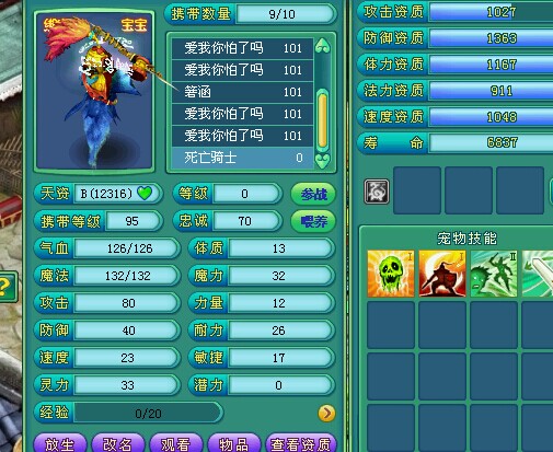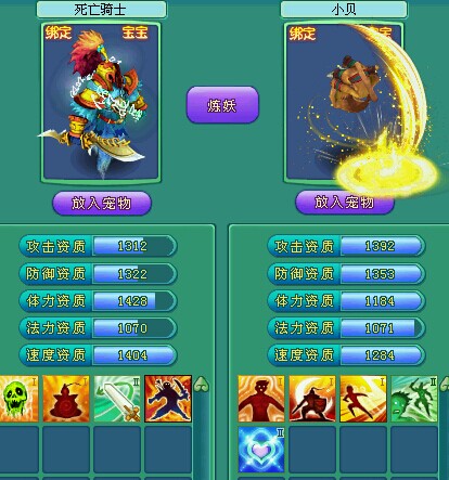 相关资讯: 炼妖教导,直播示范,炼妖宠物哪家强,什么宝宝才是合适的炼妖宝宝呢。 炼妖首选!4技能舍身死骑,因为舍身一搏能够弥补炼妖资质太渣导致的伤害不足,有了舍身威力依旧惊人! 而第二只则是选择多技能的宠物,洗丹便宜的推荐异蛇,霜狼和赌鬼,这里我刚好有一只5技能的小贝,就那这个做示范吧。 相关资讯: 然后就是把两只宝宝练级或者喂宠物经验心得,让他们到30级,还有注意下他们的技能,如果有重复的技能就打书顶掉吧,不然会少一个技能格子,最后轻松一点,就会合成一只9技能的神兽!