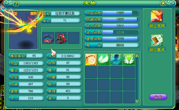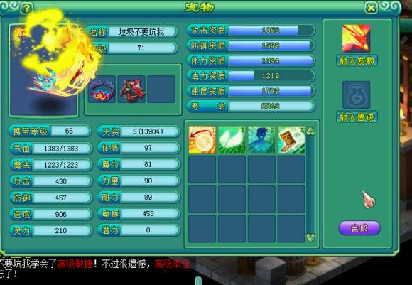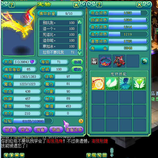 高级隐身把魔法反击打掉就完美了!一只美好的千速宠就此诞生了。 相关资讯: 我就知道世事没有那么一帆风顺,高级隐身顶掉了高级敏捷,魔法反击竟然还在。