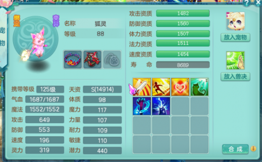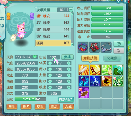 六技能狐灵打书,虽然法宠打书还算是便宜,不过感觉最近的神武币来的好慢,先上主角图,护符也还没有选好; 话不多说先上一本法宠的输出爆发-高级法术暴击. 那个第一本应该不会直接掉禁锢吧? 这一本书打完还是很满意的,小技能保命被顶掉了,而且禁锢还在; 这个护符也是洗了好久的了,没什么好的护肤,感觉还是能凑合用的。 最终是要打造成这样子,高神佑,高法连高法爆高灵性高强壮,护符是高厄运这样。 过程什么的就不准备等了,无非就是两种,一种是特殊掉了,花大价钱打潜能;一种是特殊没掉,法宠打书花费的价钱也不多。最终的打书结果是一样的。 [编辑:Hi、何同學]