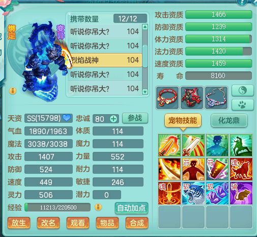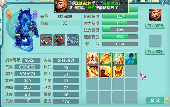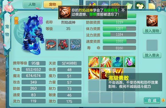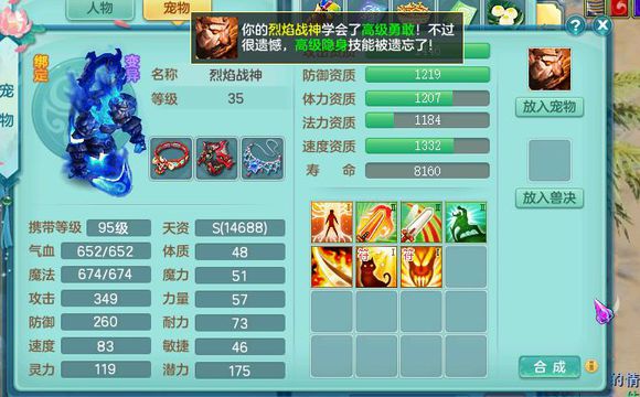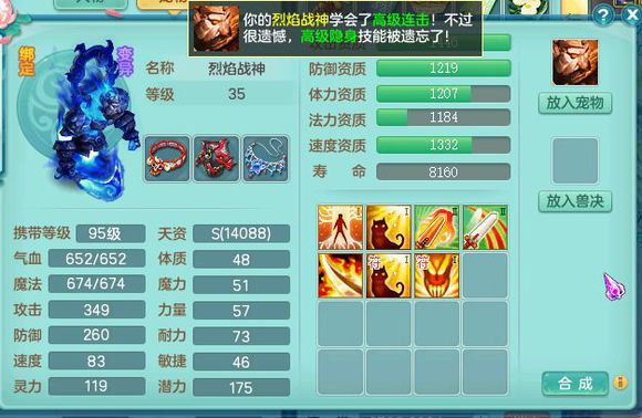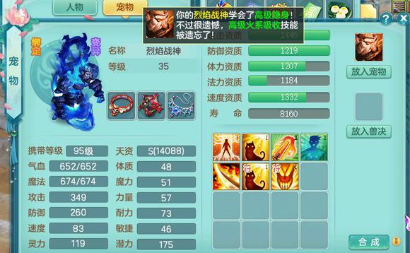 刚洗好一只五技能烈焰战神,一般带特殊技能的宠物,打书都是会有很麻烦的。接下来看看这只五技能烈焰的打书全程。 本身想着要是烈焰斩被打掉了。用潜能找回的话,就先带个灵性护符。第一本书高级隐身,成功的顶掉了高级火系吸收。 紧接着的高级连击顶掉了高级隐身,这应该就是不祥的预兆吧? 再次的打上了一本高级隐身,瑟瑟发抖的烈焰斩和高必居然还在,灵性被顶掉了,有点小惊喜。 找回了点底气之后接着打书,一本高勇敢再次的顶掉了高级隐身,嗯....高级隐身有点众矢之的的感觉。 随着高级隐身的第二次下岗,场面变得有点尴尬,但是还是要继续的撑下去,不能怂,接着上高级隐身。成功的太快,有点不可置信。 高必、烈焰斩全程坚守阵地!这个书打的也是很顺畅的样子。 最后换个高审判感知护符,美滋滋的蓝心五技能烈焰! [编辑:Hi、何同學]