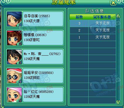 相关资讯: Hi,大家好,叶子猪新人兰茵跟大家见面了~ 大浪淘沙铁骑铮铮,神武迎来了第三届神武之战联赛。今天为大家带来的是截至2012年12月16日的联赛冠军专访。 作为“世界末日”前的最后一场联赛 ,兰茵特别关注了下,卫冕冠军服务器 天下无双 的3支队伍A、B、D 迎来了笑傲江湖、普天同庆等服务器各路强队的挑战。最后一轮,天下无双自导自演队经过苦战击败了重组的上届冠军若即若离队,问鼎第三届神武联赛冠军。我们很荣幸邀请到本次联赛的冠军队长 自导自演 接受采访,看看他对本次历程的看法和今后的展望。 本届冠军队伍 兰茵:你好,哈哈,首先恭喜你拿到本次联赛的冠军。队伍在你的带领下登顶,最大的感触是什么? 自导:能连着2天看到我徒弟和刺青都在游戏上.. 兰茵:服战的时间安排的那么紧,这么说比赛的时候都是本人啦 自导:都是本人,不过时间可以说都硬挤出来的..顺便爆下刺青每次打服战都得提前和他媳妇商量好...做好家务好好表现才能让他服战。 兰茵:哈哈,看来打次服战异常艰辛付出不小,相信大家对你们队伍都有一定程度的了解了,不过还是想请你先介绍下自己和队友。 自导:队里5个号的话其实就3个人....DT和PT都是我的号。。。姐姐早安和脸红红是1个人..还有个就是刺青了.. 兰茵:脸红红姐姐早安是女孩子吗? 自导:是的...超级无敌可爱的18岁黄花大闺女..(小编说:姐姐早安是可爱的姑娘,人见人爱) 兰茵:你是怎么忽悠人家大美女组队的呢 能谈下秘诀么 自导:刚好有段时间我们原来的队伍散了,早安他是我的徒弟,就去问他去问有没兴趣过来和我一起玩了。 兰茵:因为专注PK的女孩子很少很好奇,说说你自己吧~自导是怎么走进神武走进服战的? 自导:最早内测时候和一群朋友一起进来玩的,我喜欢PK很早就在期待出服战的了。 兰茵:最近总算出了服战 也算是如愿以偿了 自导:是的,每个月算有个期待。