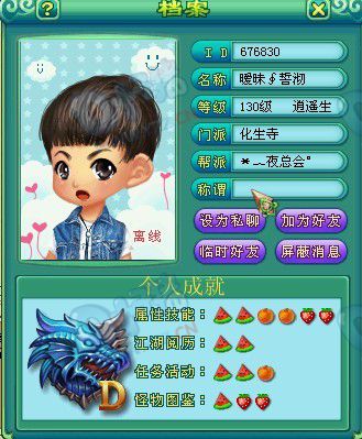 相关资讯: 前言: 跟复古、爱认识是从我收珍珠开始,得知他长期有大量珍珠,就这样认识了。慢慢熟知,他有打服战的雄略。 虽然还未有参过一场服战,目前还在为服战目标努力的他,每天都在积极的点修和刷经验,期待展露头角,据说服战团队已然组建成功(2LG,1DT,1HS,1TM)。 抢先让大家认识这位高富帅吧----------------- 笑傲江湖之复古、爱 编者: 你能提供下你的属性吗? 复古爱: 我那个属性是打F,没卡的状态,吃海象卡6600+血。[目前等级121LV] 编者: 你的战队都有哪些成员呢? 复古爱: 战队,歌调说到时候要HS侍妾还是其他的还没决定,知道的是歌调,我和夜盼盼, 夜云天。 这是他们其中的经验排名分别是17,25,29名。HS26名 编者: 是什么原因让你萌生了想打服战的年头呢? 复古爱: 主要还是想展示一下笑傲的实力。毕竟笑傲封系是牛毛,基本拿不出个很牛逼的。 编者: 对于你们目前组建的战队配置,你觉得满意吗? 复古爱: 我个人觉得,要是有个DF,换成1LG,1DT,1HS,1TM,1DF会好很多,但是我们区很牛逼的DF找不出来。 编者: 据悉,歌调第一次服战,拿到前三的成绩,为什么都没有他打服战的身影了呢? 复古爱: 他的意思是,这么多日子不参加服战,为的是一次性拿到前三,绝对不随便去,要一次性展现出实力。 复古爱:你怎么不去打服战了啊? 歌调:我装备没弄好!我丢不起脸啊。 复古爱:难道你打算一次性去拿前三? 歌调:我拿过前三的。 复古爱:等我到125,满修之后,求带我去。 歌调:这个区,我第一个拿前三的,如果你等级上来,我们可以固定。 编者: 那你现在准备得如何了? 复古爱: 前提就是我一个月内上125+。修炼啥的很简单,帮派每天都点信誉换修,基本全满。主要是帮派现在每天都没资财给我点了,不然早就点满了,我准备1周2级,满修满技能的升级,这样BB等级也上去了,就不会吃亏。 编者:你现在都如何刷经验的呢? 复古爱: 除了日常,每天100本人物经验书,江湖志能收多少就吃多少。 区里一般收江湖志价格是7W。 编者: 你都有拿金币换信誉吧,高级修炼点1级耗费不少信誉的,压力大吗? 复古爱: 还好吧,经济上还过得去。 编者: 嘿嘿,我期待你经常有大量珍珠卖我。 复古爱: 嗯,会的。 编者: 再一个就是希望你们全力以赴,拿出笑傲新好成绩,拿到神武之战名次。 复古爱: 谢谢。会的。