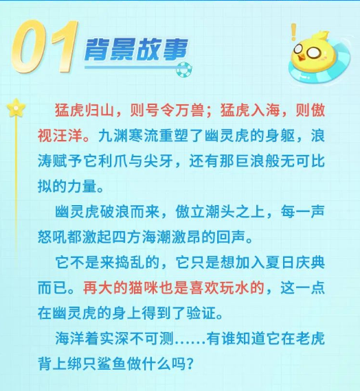 《神武4》手游昨天爆料的新皮肤很多小伙伴都猜对了,没错皮肤的原型就是幽灵虎,今天继续为大家带来幽灵虎清凉夏日皮肤爆料~ 幽灵虎·清凉夏日背上居然是只鲨鱼,还有泳镜,也太酷炫了!胖子,什么时候上线啊? 幽灵虎·清凉夏日新皮肤将于6月3日(本周五更新后)上线! 扫一扫以下《幻唐志手游》二维码,根据自己的手机(安卓版、IOS版),下载对应的幻唐志手游客户端!赶紧邀请小伙伴,一起畅玩游戏! [编辑:ssc]