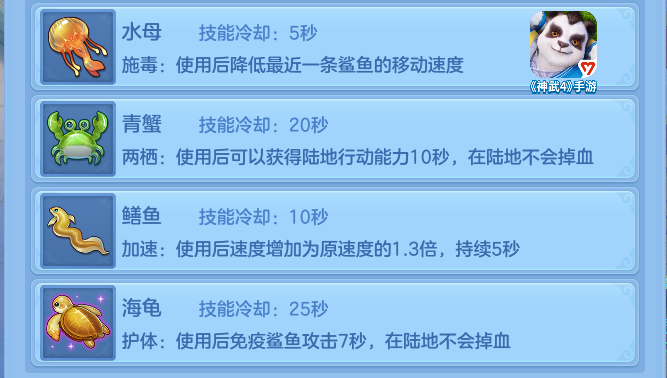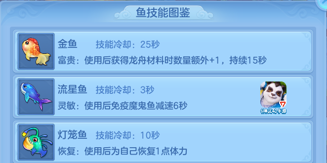 中国传统节日——端午节即将到来,《神武4》手游中也推出了有趣的端午系列活动,让我们一起来看看吧! 端午寻舟活动简介 2022年5月27日至6月23日,每日8:00-23:00开放,少侠可通过日程或长安巷龙舟艺人参与活动,每人每天可获得2次奖励,最多可参与5次。少侠组队换上泳装下水寻找龙舟材料,可以抓鱼获得鱼技能,最多同时获得2种技能。需躲避鲨鱼攻击,拾取粽子恢复体力。 规定时间内全队收集30个材料可完成任务,获得粽子奖励。收集的材料越多,获得的粽子品质越好。获胜后贡献前2名可获得随机鱼变身带出场景,持续一段时间,第1名可变成流星鱼和金鱼等造型。每局全场最佳的少侠可收录排名,用时越短排名越高,活动结束将给排行前20名的少侠发放鲨鱼等稀有变身水晶。全场最佳累计5次和10次可获得称谓。 鱼技能图鉴 其中有趣的一点就是各种变身,通过变身各类鱼能获得各种技能,加速、护盾、增加龙舟材料等。以下总结了各类鱼的能力,想体验如何穿梭在鲨鱼之中,取宝箱、粽子,可以到游戏中进一步探索。 金鱼——富贵:使用后获得龙舟材料时数量额外加1,持续15秒,技能冷却:25秒。 流星鱼——灵敏:使用后免疫魔鬼鱼减速6秒,技能冷却:3秒。 灯笼鱼——恢复:使用后为自己恢复1点体力,技能冷却:10秒。 水母——施毒:使用后降低最近一条鲨鱼的移动速度,技能冷却:5秒。 青蟹——两栖:使用后可以获得陆地行动能力10秒,在陆地不会掉血,技能冷却:20秒。 鳝鱼——加速:使用后速度增加为原速度的1.3倍,持续5秒,技能冷却:10秒。 海龟——护体:使用后免疫鲨鱼攻击7秒,在陆地不会掉血,技能冷却:25秒。 端午节奇遇开放 除了端午寻舟之外,活动期间,开放了端午节奇遇【端午遗俗】,欢迎各位少侠体验端午故事,佳节将至,祝少侠端午安康! 扫一扫以下《幻唐志手游》二维码,根据自己的手机(安卓版、IOS版),下载对应的幻唐志手游客户端!赶紧邀请小伙伴,一起畅玩游戏! [编辑:ssc]