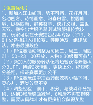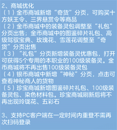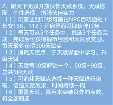 1.萌萌的蘑菇,霸气的龙驹,双人坐骑这周终于全服开放了。可以在游戏里前往长安神秘商人处查看相关规则,我在前两周的更新解读中也有提及,不太清楚的朋友可以去看看 本周调整: (1)购买入口改在金币商城 (2)购买以后自行根据自身喜好选择蘑菇或者龙驹 (3)如果两只坐骑都很喜欢的朋友,可以购买2次双人坐骑元神,同时拥有蘑菇和龙驹。晴天蘑菇,雨天龙驹,就是这么任性 (4)重头戏来了:买完双人坐骑后,会额外送一套坐骑属性和技能方案。现在跟飞行坐骑的属性技能方案相互切换了。我前两周买了坐骑以后,新坐骑的属性球和技能都没培养好,在实战时骑原来的飞行坐骑,泡妹子时骑蘑菇,来回切坐骑还是挺麻烦的。现在可以直接把飞行坐骑的属性技能方案换到双人坐骑上了,原本那些担心买完双人坐骑后,不得不重新培养的朋友是不是松了一口气 (5,6)坐骑放生功能取消,已放生的坐骑仍然可以找回。现在可以用银币兑换飞行坐骑造型了, 我踩了这么多年的莲花终于可以换换口味了,我要换成霸气的飞剑 (7)坐骑光华和装饰支持赠送了,爱她就给她最美的宠物,听不进去的朋友肯定是单身 (8)双人坐骑还是太挡了,在狭小的活动场景,数量一多什么都看不见了,这个更新还是挺好的 附上蘑菇和龙驹的图片,真的挺好看。 2.我的天哪,伙伴也要有天赋技能啦,以后竞技场和单人pk要风云大变了吗,坐了万年冷板凳的天宫伙伴会不会翻身做主人公告中对规则也介绍得很清楚了,大体规则是: (1)50级以上玩家每天可以完成3个任务来获取天赋点,天赋点可以用于学习和升级伙伴天赋。我体验了一下,任务都很简单,领取和完成任务也不需要什么成本 (2)伙伴天赋技能每10级解锁一个,一共有5层天赋,每层天赋应该都要选择学习哪个技能,我看了一下,每个伙伴的第一层都有2个技能可选,贴张天策伙伴第一层天赋技能的图 (3)天赋技能等级学满之后,应该是消耗一定的天赋点进行突破,获得更强的技能效果,持续1周 (4)可以重置天赋,这样楼主就可以摸索出属于自己最强的天赋组合啦。以后竞技场上分,神挡杀神,佛挡杀佛 这次伙伴天赋更新,我估计并非只是加强伙伴这么简单,根据选择天赋路线的不同,每个伙伴可能都会产生多个流派,伙伴之间的组合和配合也会更加多样和有策略性,相信以后的竞技场和单人擂台、帮派友谊战会变得更加有意思。求各路大神分享伙伴天赋攻略,让我早点确定好伙伴天赋路线。 3.上周公告已提及,这周应该是完善了功能并再次开放; 4.海底迷宫新增boss和地形优化,容楼主体验后再和道友分享; 设置优化: 1.前几周的排位赛不知道大家是否玩得开心,反正我已经被基友带着上了一波分; 这周再次调整活动时间,新加入的服务器前两次活动有双倍积分加成,并且恢复了擂台药中灵心丸和酒类的效果,各位道友不用担心没有高品酒放不出大特技了 排位赛奖励将根据战斗评分发放,老是挂机经常输的朋友要调整上分姿势了。公告都说了,要认真战斗才有更多机会获得奖励 ; 2.商城界面优化,新增妖王令和三界悬赏令的购买,来一波土豪好友每天请客让我混躺赢可好? 部分商品所在的分页进行了调整,新增装备灵礼包:450金币,包含5个100级专用装备灵。珍宝商城新增部分商品,以后也见不到价格经常比市场价还高的玲珑花和五彩石了; 3.平时用电脑版玩,扫码登录后掉线又得重新扫码,还是挺麻烦的。现在进行了优化,好评; 这周的更新解读就到这里了。 扫一扫以下《幻唐志手游》二维码,根据自己的手机(安卓版、IOS版),下载对应的幻唐志手游客户端!赶紧邀请小伙伴,一起畅玩游戏! [编辑:Hi、何同學]