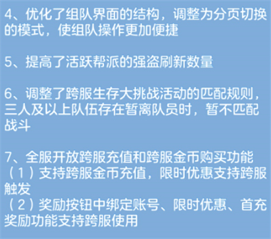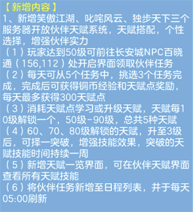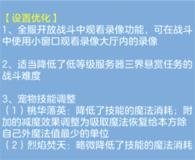 歌星许嵩代言神武,游戏里也有福利,可以在游戏里真人定制NPC处免费领取代言人礼包,每天可以领2小时普天同庆效果,之前预约过的朋友记得输入预约使用的手机号码来领取新手礼包, 新增内容 1.伙伴天赋上周解读已提及,不太清楚的朋友可以去看一下 上周我有好几天忘记做伙伴天赋任务了,感觉有点亏,估计不少小伙伴也和我一样。现在伙伴任务新增到日程列表,在日程里点击就能自动寻路去领取任务了,再也不用帮派管理人员发公告人工提醒了; 另外在伙伴天赋界面可以预览所有天赋技能,我大概看了一下,感觉技能还是挺多样的,贴张白无忧80级天赋的图。求大神指点天赋选择套路。 2.排位赛全服开放,时间调整为周三21:00-22:30和周六15:30-17:00,周六如果有服战则取消当天排位赛,周三门派闯关时间继续调整,仙石战场活动正式取消了。昨天赛季结束,小伙伴们都冲到什么段位了?新赛季又可以调整姿势上分了,这次全服玩家一起竞争上分估计会更刺激 。持续两个月的新赛季结束后,你又将会在哪里? 3.之前一般都是通过好友秀发或微信私聊发图片给好友看,现在好友私聊也能发送图片了有木有,撩妹更加无人可挡了,必须点个赞! 4.平时在游戏里,基本上是和几个好友在吹皮扯淡,其他好友可能聊得比较少。现在可以把重点聊骚和关注对象置顶了,不管他在线不在线,始终会排在好友列表里的最上面,关注和聊天更方便; 设置优化 1.战斗中观看录像全服开放 2.楼主也冲过几个新服,在新服打三界既组不到人,又难打。现在降低了新服的三界难度,新服的朋友可以去试试 3.115级宠物桃花仙子加强,特殊技能桃华落英现在不仅可以打蓝,还可以给本方除桃花仙子自己以外魔法值最少的单位回蓝,并且技能耗蓝降低。 这次改动可能会影响高端PK的格局,在回合数过长的PK中拉只桃花仙子出来打蓝和回蓝还是挺好的 瑶池青鸟的烈焰焚天蓝耗也略微降低,相当于变相小加强了 喜欢PK的朋友,可以实战后告诉我效果怎么样,我现在还没决定好洗哪只115宝宝; 桃花落英:物理攻击技能。临时提高自身的攻击力和命中攻击敌人,吸取魔法值补充给本方除自己外魔法值最少的单位,最高吸取魔法值=自身等级*1.5,力量加点越少吸取越少。一回合内同个目标被多次吸魔时效果衰减 消耗魔法:自身等级*3.5 4.组队界面优化 5.我的帮派很活跃,平时12点和下午6点的强盗,基本上只能抢2-3只,希望改动后能改善一点 6.生存大挑战匹配规则优化,不知道你们有没遇到过,有时候楼主迟到进场,刚组了几个队员,但是他们都在战斗中所以会保持暂离状态,楼主就等他们归队。但是在等的时候,系统又帮我匹配了,队友结束战斗后看到归不了队就纷纷离队了,很蓝瘦 7.跨服支持充值和金币消费。以后在跨服、临时服也可以充值和进行一些金币相关操作了; 小伙伴看看你遇到的BUG修复了没 ; 这周的更新解读就到这里了; 扫一扫以下《幻唐志手游》二维码,根据自己的手机(安卓版、IOS版),下载对应的幻唐志手游客户端!赶紧邀请小伙伴,一起畅玩游戏! [编辑:Hi、何同學]
