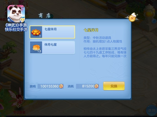 【《神武3》手游中秋活动——无忧饼坊:城区订单】 同时,《神武3》手游还特别推出了“七星伴月”及“伴月七星”,使用后能够随机增加1点人物属性。活动期间,玩家们可以使用一定铜币限兑换一次“七星伴月”。过往节日错过的属性道具,将以“伴月七星”的形式出现在月饼商店中,玩家可以消耗一定的铜币进行兑换。