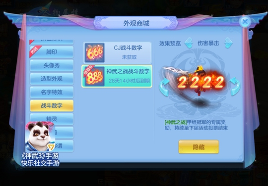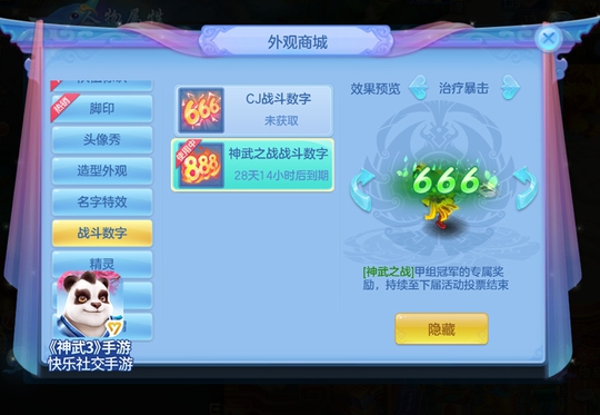 本周维护更新后,获得神武之战甲组冠军的队伍全员,都将获得有效期至下届神武之战投票结束的全新道具“甲组冠军战斗数字”,使用该道具后即可获得专属的战斗数字特效,可令自身的伤害、治疗等数字都变得更加炫酷。“神武之战战斗数字”可在外观商城的“战斗数据”分页中切换回普通战斗数字,有效期内切换次数无限制,以彰显其傲视群雄的王者风范。