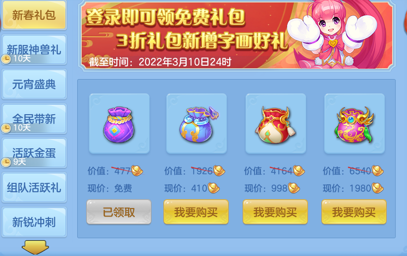 《神武4》手游跨平台新服“春满山河”将于2月18日正式开启,新服神兽礼、活跃金蛋、全民带新等多重福利活动同步来袭,让你奖励拿不停!赶快来《神武4》手游领略更多快乐玩法吧! 开服信息如下: 2月18日星期五10:00春满山河 安卓、iOS跨平台新服 首充礼包 首冲即送强力萌宠·总价值高达100元 首次充值任意金币,即送强力萌宠“熊小竹”和“熊小月”,更 有强力新伙伴“墨灵儿”陪你闯荡江湖! 新服神兽礼 冲级赢好礼,在线抽神兽 达到等级要求即可获得抽奖资格,活动共有五期,累计将会送出头像券、时装礼品券、高级坐骑、随机神兽等惊喜大奖。 签到奖励 每日签到·领强力萌宠伙伴 游戏前十五日每日上线签到即有豪华大奖领取,其中第二日签到可获得成长型强力萌宠,第七日签到可获得无需培养的限时强力伙伴。 新春礼包 上线领福利·获取免费礼包 所有≥30级的少侠可免费领取第一档礼包,同时还有三款超值特惠礼包任小伙伴选择。 活跃金蛋 活跃、充值砸金蛋·大奖拿不停 活动期间通过获取活跃度或达到一定充值条件,可以获得敲蛋次数,更有机会获得源生之灵、高级坐骑元神等大奖。 首充翻倍 首次充值双倍奖励 所有角色首次购买各个档位的金币时,皆可获得额外赠送的等量金币。 在线有礼 在线抽大奖,明日带回家 角色等级达到16级开放为期8天的在线有礼活动,活动期间累计在线时长即可获得抽奖机会,抽中的奖励只需次日上线即可领取。总计28次抽奖机会,多种大奖等你来拿。 特惠商城 多种折扣礼包·最高可达1折 新服开启的前半个月开放特惠商城,其中出售包含头像劵、洗宠礼包、坐骑元神·高级等多种超值限量道具,最高优惠额度达到1折! 昕计划 完成目标领奖 30级开启昕计划后,只要达成指定目标便可领取奖励,解锁进阶版后还可领取对应目标的进阶大奖。 成长基金 购买立享金币奖励·共十倍返利 68元可购买,购买后立刻获得等价值金币,之后只需达到指定等级还可领取包含金币在内的各种返利,总价值高达10倍! 升级奖励 提升等级即有超值好礼 20级开始,每提升10级即可免费领取一份升级礼包。同时还有超值的“实惠升级礼包”可供购买,其中包含通灵符、通灵丹、元宵礼包多种限量道具。 征战礼包·小昕优选 帮助各位玩家更快适应神武世界 根据多数玩家的选择进行推荐,新服玩家通过充值金币购买礼包的方式快速提升自身实力,畅游三界。 新锐冲刺 参与赛道·赢取称谓奖励 开服前15天,在经验、成就、竞技、帮派、战队5条赛道上达到一定条件即可领取奖励,冲刺结束时每条赛道的前10名还可领取包含专有称谓在内的大奖! 扫一扫以下《幻唐志手游》二维码,根据自己的手机(安卓版、IOS版),下载对应的幻唐志手游客户端!赶紧邀请小伙伴,一起畅玩游戏! [编辑:ssc]
