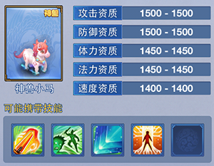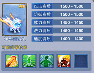 神武手游神兽怎么样?神兽如何获取?【神兽图鉴一览】 NO1.【神兽雪精灵】 攻击资质:1500-1500 防御资质:1500-1500 体力资质:1450-1450 法力资质:1450-1450 速度资质:1400-1400 可携带的技能:高级必杀、高级神佑复生、高级感知、夜战 宠物获取途径:收集80个【神兽之灵】,就可以兑换珍兽。神兽之灵可以通过山水玄机图获取,还可以在市场购买。 NO2.【神兽小龙人】 攻击资质:1500-1500 防御资质:1500-1500 体力资质:1450-1450 法力资质:1450-1450 速度资质:1400-1400 可携带的技能:善恶有报、高级敏捷、慧根、高级勇敢 宠物获取途径:收集80个【神兽之灵】,就可以兑换珍兽。神兽之灵可以通过山水玄机图获取,还可以在市场购买。 NO3.【神兽小马】 攻击资质:1500-1500 防御资质:1500-1500 体力资质:1450-1450 法力资质:1450-1450 速度资质:1350-1350 可携带的技能:高级必杀、高级追击、高级冲击、慧根 宠物获取途径:收集80个【神兽之灵】,就可以兑换珍兽。神兽之灵可以通过山水玄机图获取,还可以在市场购买。
