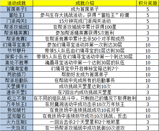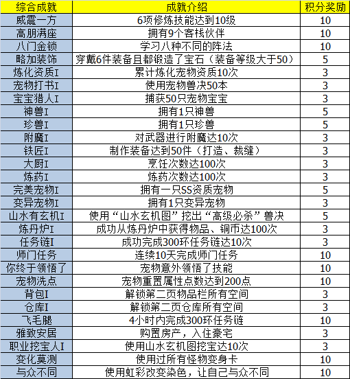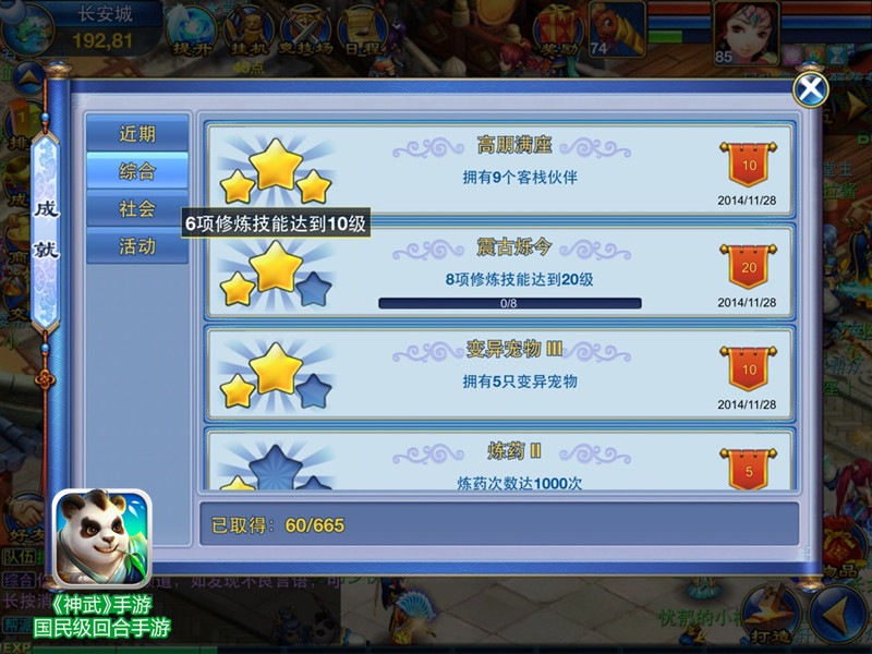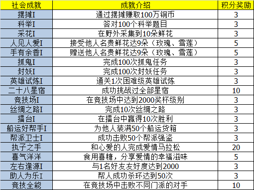 《神武》手游荣膺App Store畅销榜冠军,连续十周雄踞iPhone和iPad畅销双榜前十,引领网游手游新趋势,12.5日最新版本的更新,全新的成就系统火爆上线了,让我们一起来一睹成就系统的芳彩吧! 如何进入成就系统? 首先,在游戏主界面的左侧栏,可以找到【成就】,点击进去,即可进入成就系统了。 成就系统中主要分4个组成部分(近期、综合、社会、活动),下面让小编给大家一一讲解下吧! 【近期】 这里是显示玩家最近时间所获得的全部成就,无论是综合的,还是社会、活动的成就,玩家最近获得成就越多,近期显示的成就也就越多。 【综合】 综合成就主要包括了各种宠物相关的成就以及其他综合成就了,如下表: 【社会】 社会成就主要是包括游戏社交活动以及一些任务活动所获得的成就,详细成就如下表: 【活动】 活动成就,完成游戏中各种特色活动玩法,所获得的成就,详情如下表: 成就积分有什么作用? 在成就系统中,玩家所获得的成就越多,得到的成就积分就越多,那么成就积分有什么用呢?其实,最新的版本更新同时开放了成就排行榜,该榜是根据玩家成就积分的高低,收录最高的100名玩家,每天24点刷新排行榜数据,玩家所获得的成就积分越高,那么在成就排行榜中的排名就越靠前。 好了,以上所述,都是关于最新开放的神武手游成就系统的相关详解了,本攻略原创于:【15666手游通】,未经许可,不可随意转载!更多相关攻略,敬请关注我们的神武手游官网。 扫一扫以下《幻唐志手游》二维码,根据自己的手机(安卓版、IOS版),下载对应的幻唐志手游客户端!赶紧邀请小伙伴,一起畅玩游戏! [编辑:Dickson]