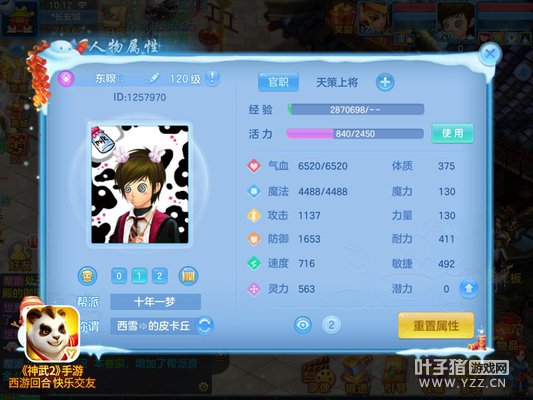 第十七届神武之战已经于2月19日落下帷幕。通过一场场实力与策略的比拼,天下无双A队与清风明月F队分别获得了甲组与乙组的冠军。天下无双A队在去年取得甲组三连冠的佳绩后曾休整了一段时间,如今他们再度问鼎冠军,成功打破服战历史上夺冠次数最多的历史。已经率先一步达到120级的他们在装备、面板上都有所更新,今天我们就和大家一起围观一下! 堪称典范的面板属性 佛门人物宠物面板 早在麻将队拿到第一个神武之战冠军的时候,佛门就给大家展示过他的属性,当时是接近2100的防御!而现在,防御虽然降了,但血量高达9007,血厚到不行!除此之外,他的宠物也是相当肉。用他的话来说就是:我一直都是在追求特立独行的属性。