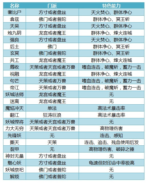 上古妖王是大家在神武3手游中接触到的第一个挑战玩法。每天前两次战胜上古妖王概率获得物品奖励,奖励应该算得上肥厚吧,小到藏宝图,大到神兽灵、高级魔兽要诀,只要脸好没有什么奖励是不可能的。面对奖励如此之高的上古妖王玩法,那么问题来了,该怎么打才能稳过拿奖励呢?接下来会介绍关于上古妖王的所有打法,保证成功率超过99%。 正所谓知己知彼方能百战不殆。首先先给大家介绍下妖王战斗中出现的小怪都是些什么类型的怪。以及12个以巫族为背景的boss:奢比尸,翕兹,天吴,烛九阴,强良,后土,玄冥,共工,蓐收,祝融,句芒,帝江。 【奢比尸】方寸或者盘丝门派技能,回合初必定触发天火焚心 【翕兹】佛门或者普陀门派技能,概率使用冥王斩 【天吴】方寸或者盘丝门派技能,回合初必定触发天火焚心 【烛九阴】龙宫或者魔王门派技能,概率会使用特技烽火连城 【强良】方寸或者盘丝门派技能,回合初必定触发天火焚心 【后土】佛门门派技能,概率使用冥王斩 【玄冥】佛门或者普陀门派技能,概率使用冥王斩 【共工】龙宫或者魔王门派技能,概率会使用特技烽火连城 【蓐收】天策或者天宫或者万兽门派技能,概率释放特技嗜血连击 【祝融】龙宫或者魔王门派技能,概率会使用特技烽火连城 【句芒】天策或者万兽门派技能,概率释放特技嗜血连击,破魔斩,蓄力一击 【帝江】天策或者万兽门派技能,概率释放特技嗜血连击,破魔斩,蓄力一击 值得注意的是所有主怪都是免疫异常状态的,而且当场上被封印目标大于等于3个时大概率使用群体净心,在进行妖王战斗的时候千万注意不要让场上被封印目标大于等于3个 接下来系统的介绍下上古妖王玩法中小怪的名称及对应的能力。法系怪物名称分别为【妖城法师】,【魔焰冲天】,【翻江】,【迷离】。其中【妖城法师】和【迷离】一般是龙宫或者魔王的门派技能,但是法术伤害能力一般,威胁不大;【魔焰冲天】为暴力单体法术怪物,经常触发一次法术暴击可以带走一只宠物;【翻江】是会特殊法术狂涛巨浪的法系怪,法术伤害能力及法术暴击概率都极高,建议可以优先击杀或者封印。 物理系怪物名称分别为【妖城悍将】、【力大无穷】、【先锋妖】、【裂甲】、【撕天】。其中名字为【力大无穷】的怪物物理攻击会远高于【妖城悍将】,一般会使用天宫或者万兽的门派技能;金刚狼造型的【撕天】自带连击和追击,血量低时会使用后发制人;龙虾骑士造型的【裂甲】会释放破碎之锤,伤害极高堪比物理系妖王,不过血量和防御都比较普通,属于集火后容易击杀的单位。 上古妖王玩法中封系怪只有两种【神封无量】和【魅心妖】。其中无常造型的【神封无量】速度较快,而变异芙蓉造型的【封禁】是一个龟速封但是命中率极高,建议第一回合可以优先击杀封系怪物。 治疗怪物也只有两种【妖城祭祀】和【解烦】,一般都是使用佛门或者普陀的门派技能,不会使用任何特技。治疗怪物的怪物智能程度比较低,没什么好特别针对的,一般可以无视放到最后再击杀。 妖王玩法一般来说【魅心妖】是最高优先级击杀的,然后选择击杀物理系怪物并封印法系怪物。这么做是因为法系怪被封之后威胁几乎为0,不像物理系怪物被方寸封印后会进行普攻。不过也有部分妖王的打法是优先击杀主怪,在后面的攻略中会一一举例详细说明。 最后给大家总结一份关于上古妖王怪物的能力表格,仅供参考。 扫一扫以下《幻唐志手游》二维码,根据自己的手机(安卓版、IOS版),下载对应的幻唐志手游客户端!赶紧邀请小伙伴,一起畅玩游戏! [编辑:GEM]