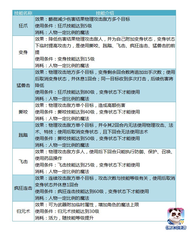 各位小伙伴们,大家好!看完上一期的天策门派攻略介绍,相信大家对天策,这一单体爆发极高的物理门派有了更深的了解。今天无忧将继续给大家带来第二个门派的攻略,这次给大家讲解的是神武3中以群体爆发闻名的物理门派——万兽岭,话不多说,赶紧进入正题吧! 门派介绍 自蚩尤战败,大敌消失,黄帝一脉所豢养的猛兽也就失去了作用,被人苛刻对待。黄帝羽化后,这些猛兽的待遇也愈加不堪。其中有一头青狮率领众兽,打破囚笼,后自号万兽之王,创立万兽岭,统御天下猛兽。其门派弟子崇尚猛兽,他们往往会变身成兽型,狂暴的攻击顷刻间就把敌人撕成碎片。另外万兽岭弟子精通上古流传的驭兽法门,他们驯养的召唤兽通常都十分忠诚,在战斗中就算生命垂危也不会丢下主人逃跑。 门派心法 【兽王】自己的召唤兽及子女不会在战斗中逃跑,召唤兽寿命消耗减半 心法解析:万兽的门派心法共有两个效果:①召唤兽寿命消耗减半更加服务于玩家们的日常活动,寿命消耗减半,意味着在补充宝宝寿命上的花费减半(宝宝寿命过低将无法参与战斗哦),很实用;②第二个效果就非常关键了——宝宝及子女在战斗中不会逃跑(战斗中宝宝及子女血量过低时有概率自动逃跑),这一效果在玩家PK中显得极为重要,举个简单的例子:这一回合中自己的宝宝需要给队友使用药品,但由于气血过低自动逃跑导致药品没有使用出来,导致战斗节奏被打乱,最终输掉整场比赛。可见万兽这一门派心法的重要性!同时,也正是因为拥有这一门派心法,万兽的宝宝及子女,在打书时可以用高夜战代替高勇敢,夜晚获得伤害加成!(后续将有更为详细宝宝打书攻略)。 门派技能 技能分析: 通过上面的技能介绍,不难发现万兽的核心输出技能都有一个共同的前提,那就是需要在变身状态下才能使用,并且万兽的输出并不连续,绝大部分技能在使用后都有1-2回合的输出真空期,这样的技能特色,使得万兽每一次出手都要求有足够的威慑力,否则,不连续的输出很难达到击杀敌人的效果。回过来再看看万兽最为重要以及常用的技能——飞击,相信无论是新玩家还是老玩家,经常都能够在游戏看到队友竭尽全力来帮助自己的万兽队友飞出去,而对手则千方百计地想要限制对面万兽飞击的情况,可见“飞击”作为万兽最为重要的输出技能,其效果之强大,也正是因为这个技能,笔者也把万兽定位为一个群体高爆发的物理门派。当然,并不是说其他的技能就没有用,撕咬作为一个高额单体伤害技能,且是唯一一个使用后不需要休息的输出技能(狂爪除外,不需要变身即可使用),在很多时候能够起到关键作用,比如:当自己变身状态只剩2回合时,如果飞出去,那么会有连续2回合的输出空档期,这时就可以先用撕咬来进行输出,再使用飞击,最大化利用自己的变身状态;践踏与疯狂连击,一个无敌霸道的输出+封印技能,一个高强力的单体点杀技能,效果显而易见,但使用后的代价也相对较大,合理的使用,可以把这些技能的效果发挥到极致。 加点分析 ①纯暴力爆发流 加点方案:全力 装备属性:装备附加属性选择力量 装备特技、特效:嗜血连击、蓄力一击、破魔斩、愤怒、神佑、易成长、狂暴 优劣分析: 全力加点的代价就是牺牲了生存与速度,故纯暴力爆发流万兽的两个明显缺点就是脆、慢,这也就意味着基本与物理1速无缘(装备碾压就另当别论啦),除了敌方封系的限制,还将受到敌方物理门派的限制,容易被点杀导致无法出手;优点也相当明显,全力加点带来的是高额的伤害,纯暴力流的万兽在起满增益状态(各种加攻加伤害的技能、特技等)下,一个飞击能够带来毁天灭地的效果,这种加点方式与万兽的门派定位契合度可以说是最高的! ②敏攻流 加点方案:9力1敏 装备属性:装备附加属性选择力量、敏捷 装备特技、特效:嗜血连击、蓄力一击、愤怒、神佑、易成长、狂暴 优劣分析: 加点方案之所以只推荐了1敏的加法,是为了保证万兽的输出,万兽作为一个群体爆发的门派,群伤技能——飞击,对每个目标的打击只有一下,为了保证这一下的输出,力量分配底线不能低,所以敏攻流万兽在面对敌方带非敏攻流物理门派时,能够抢下物理1速,拿到进攻先手权,减弱了敌方物理门派对自己的限制;但在面对敌方带敏攻流物理门派时,敏万兽就略显尴尬,一般情况下,敏万兽是无法从敏天策、敏天宫手里抢下物理一速的,虽然作为敏万兽,但始终无法分配过多的属性点在敏捷上,否则带来的问题就是伤害不足,无法给敌方造成威胁,同时,身板脆也依旧是敏攻万兽的缺点之一。 对于万兽岭门派的加点,笔者主推以上两种,那么耐万兽是不是就不能玩了呢?当然也是可以的,耐万兽相对比起敏攻流万兽伤害会更低,可能更加偏重于平常的任务活动中,不容易死,可以比较安心的挂机;对于PK,笔者简单推荐下耐万兽的加点方案:主加力量、附加耐力,目的是在于防住敌方物理的输出,保证在承受敌方物理门派的输出后不死,能够变身出来。 万兽作为一个群体高爆发的输出门派,在一场战斗中绝对是被敌方重点照顾的对象,同时,由于万兽门派的技能特色(输出前需要变身、输出后需要休息,且主要以飞击为主),使得万兽的输出极容易受到限制,因此特技与门派技能的组合输出就显示极为重要,从极限输出的角度出发,力推嗜血连击与蓄力一击(其他的输出特技当然也是可以的),暴力物理的不
