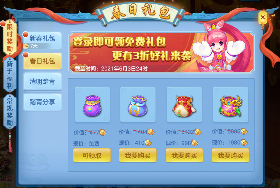 《神武4》手游跨平台新服“丹心侠骨”4月23日开启,萌新福利“昕计划”正式开放!此外,七日登录签到大礼,强力萌宠助您闯荡三界。赶快来《神武4》手游领略更多快乐玩法吧! 开服信息如下: 4月23日星期五10:00 丹心侠骨 安卓、iOS跨平台新服 签到奖励 每日签到·领强力萌宠伙伴 游戏前十五日每日上线签到即有豪华大奖领取,其中第二日签到可获得成长型强力萌宠,第七日签到可获得无需培养的限时强力伙伴。 在线有礼 在线抽大奖,明日带回家 角色等级达到15级开放为期8天的在线有礼活动,活动期间累计在线时间即可获得抽奖机会,抽中的奖励只需次日上线即可领取。总计28次抽奖机会,多种大奖等你来拿。 昕计划 完成目标领奖 20级开启昕计划后,只要达成指定目标便可领取奖励,解锁进阶版后还可领取对应目标的进阶大奖。 新锐冲刺 参与赛道·赢取称谓奖励 开服前15天,在经验、成就、竞技、帮派、战队五条赛道上达到一定条件即可领取奖励,冲刺结束时每条赛道的前10名还可领取包含专有称谓在内的大奖! 特惠商城 多种折扣礼包·最高可达1折 新服开启的前半个月开放特惠商城,其中出售包含头像劵、洗宠礼包、坐骑元神·高级等多种超值限量道具,最高优惠额度达到1折! 首充礼包 首冲即送强力萌宠·总价值高达100元 首次充值任意金币,即送强力萌宠“熊小竹”以及宠物装备,更有高额金币奖励。 成长基金 购买成长基金·立享金币奖励·共十倍返利 68元可购买,购买后立刻获得等价值金币,之后只需达到指定等级还可领取包含金币在内的各种返利,总价值高达10倍! 春日礼包 30级即可购买·限时限量超值礼包 达到30级可免费领取一份价值80元的春日礼包,同时还提供3份不同的限量3折超值礼包可供购买,其中包含通灵符、元宵礼包、铭记石等限量道具! 升级礼包 提升等级即有超值好礼 20级开始,每提升10级即可免费领取一份升级礼包。同时还有超值的“实惠升级礼包”可供购买,其中包含通灵符、通灵丹、元宵礼包多种限量道具。 新人活跃礼 携手活跃领奖 5位30级以上玩家可以通过“新人活跃礼盒”组成关联关系,关联成功即可领取奖励,组成关联关系后,在规定时间内达到指定活跃还有更多好礼可供领取。 扫一扫以下《幻唐志手游》二维码,根据自己的手机(安卓版、IOS版),下载对应的幻唐志手游客户端!赶紧邀请小伙伴,一起畅玩游戏! [编辑:ssc]