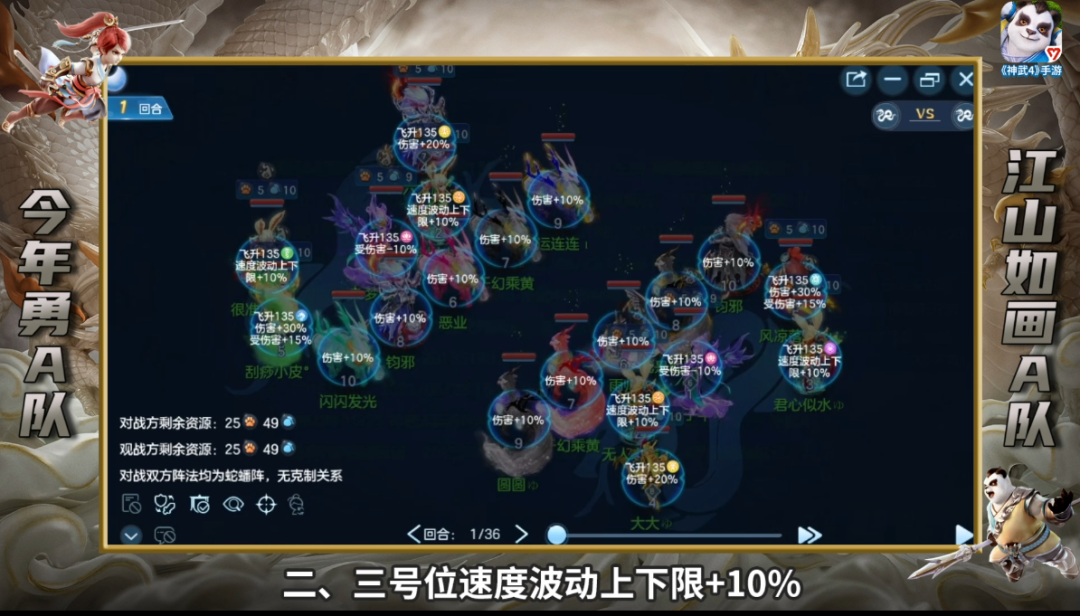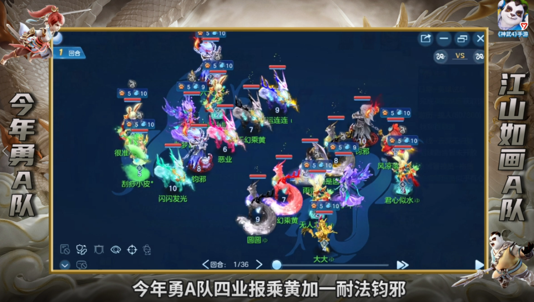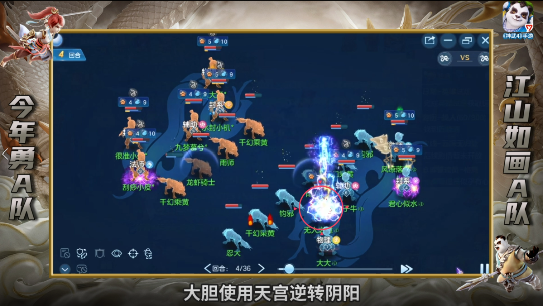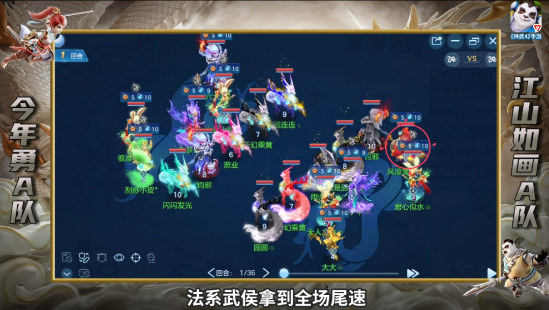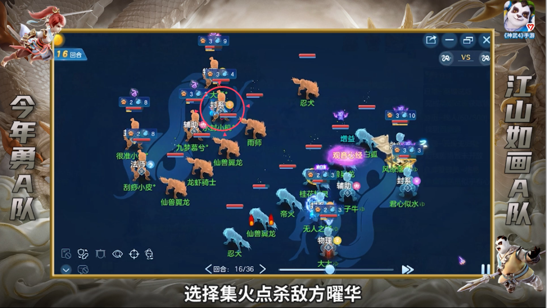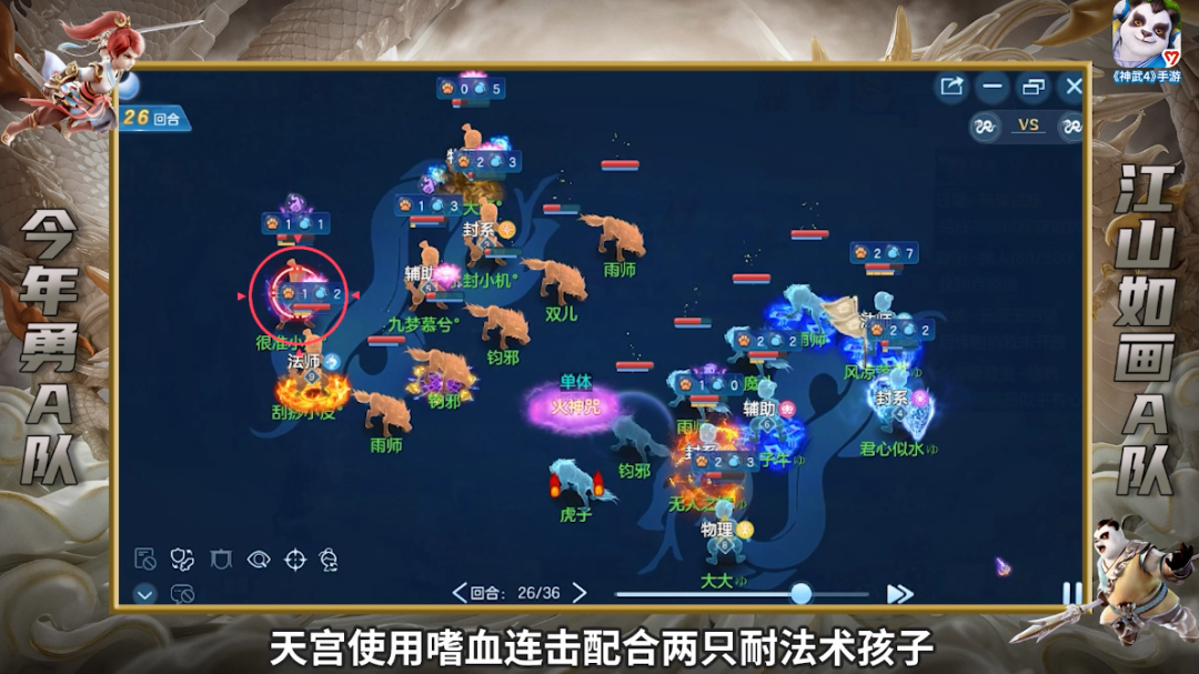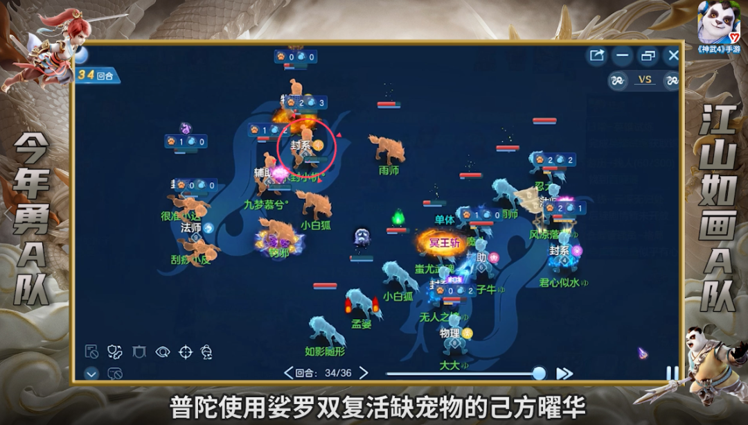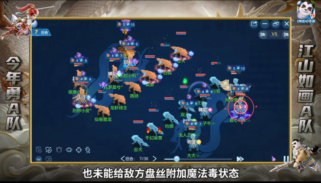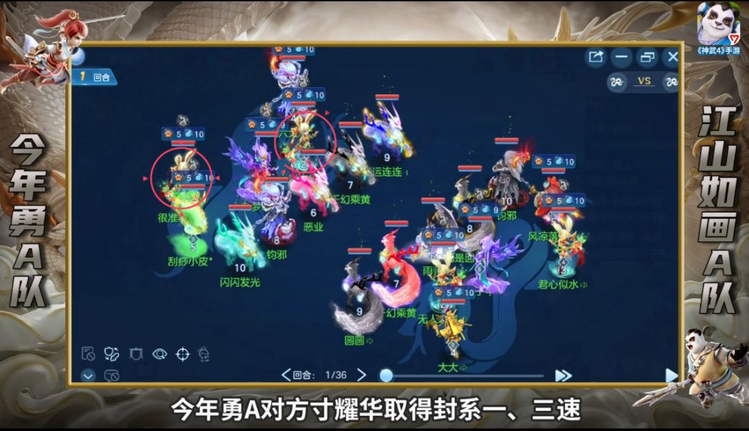 各位观众大家好,我是小昕,欢迎收看本期赛事复盘。 第69届神武之战落下帷幕,首先恭喜江山如画A队再次登顶夺取冠军。本场比赛,老牌强队江山如画A队遭遇上届服战亚军今年勇A队可谓势均力敌!今天就给大伙安排上这场决赛中的精彩对决复盘。 赛前分析 在变身卡方面: 封印门派曜华、方寸和盘丝都选择月影兔卡,治疗门派普陀为水灵卡。输出方面,今年勇A队天宫选择钧邪卡保证拿到物理一速,而龙宫选择风伯卡。 而江山A队天宫选择常规幽魂卡,法系武侯选择拥有高级报复技能的时光叽卡,加强人物残血时的输出能力。 阵法方面: 双方均为适合三辅助阵容的蛇蟠阵,一号位受伤害-10%,二、三号位速度波动上下限+10%,以及四号位伤害+20%和五号位伤害+30%的阵法加成,对于进攻性队伍来说是比较适合的阵法。 速度方面: 今年勇A对方寸耀华取得封系一、三速,普陀五速,普陀五速,输出门派天宫龙宫拿到七、九速,拿到对位全部速度优势,在局面控制和点杀人物上取得先机。 江山A队封系曜华和盘丝则拿到二、四速,普陀拿到六速,法系武侯拿到全场尾速。 首发宠物方面: 江山A队选择三业报乘黄+两敏耐四维剑气,今年勇A队四业报乘黄加一耐法钧邪。 接下来让我们结合本次决赛的精彩对决来深度复盘吧~ 速度优势初露锋芒,华丽进攻火力全开 战斗开始,双方展开试探性清宠,今年勇A队方寸入梦盘丝未能命中,曜华封印魔王命中,而江山A曜华盘丝分别命中龙宫和天宫,导致今年勇A队人物输出均未能出手。回合末双方各丢一只宠物。 第4回合,经过上回合的集火江山A队曜华处于丝血状态,今年勇A队在盲猜状态下,大胆使用天宫逆转阴阳配合一速方寸的单秒成功击倒满愤怒的曜华,使其喝酒保留的愤怒也未能使出特技。过于自信的江山A队也未使用宠物保护自己,这次操作也出乎江山A队的预料。开局双方的心里博弈已经剑拔弩张。 第7回合,今年勇A队,选择集火敌方盘丝继续扩大自己的优势,己方方寸离魂失心成功命中敌方盘丝,不料己方天宫被江山A队天宫逆转阴阳配合武侯的破阵成功击倒,在前排宠物都是物理输出的情况下伤害不足,同时龙宫的烽火连城也未能给敌方盘丝附加魔法毒状态,最终导致点杀失败。 运筹帷幄绝地反击,抓准时机击倒曜华 第14回合,今年勇A队选择集火敌方曜华,方寸入梦命中敌方盘丝限制其出宠,曜华使用群体净心保证己方所有单位能成功出手,己方天宫天眼命中江山A队曜华,由于宠物被清掉三只导致伤害不足,龙宫的雷神之锤也未能击杀导致点杀失败。同时江山A队精准预判到己方曜华会被点杀,故选择给自己使用应龙鳞,同时宠物给自己血还丹,确保自己的血量健康,同时天宫使用魂技虎噬魂惊成功吓走一只满血法系孩子,回合末没有一人倒地。一攻一守,把回合制的魅力体现的淋漓尽致。 第16回合,江山A队通过运营状态已恢复正常,选择集火点杀敌方曜华,普陀使用观音心经提高法系的输出,天宫穿云斩配合武侯的烽火连城以及法系宠物的输出强行击杀方寸,成功扳回劣势局面,吹响进攻的号角。随着战斗进入白热化,双方的心理博弈也达到顶峰。 第19回合,江山A队选择击杀敌方一速方寸,己方天宫逆转阴阳使其处于重伤状态,限制其气血的恢复。同时江山A队盘丝使用红颜薄命也命中方寸,配合前排法系宠物以及武侯的烽火连城成功击倒方寸。今年勇A队普陀处于封印状态的情况下,己方方寸很难及时复活,同时己方曜华也处于残血状态,局势对今年勇A队非常不利。 法系孩子威力无穷,封系血量难以维持 第23回合,今年勇A队普陀选择娑罗双复活曜华,己方方寸使用移魂大法成功命中敌方盘丝,并集火进行点杀,最终敌方盘丝触发门派心法一点血存活。而江山如画A队再次击倒敌方天宫,除盘丝外所有单位血量都维持健康。 第26回合,江山A队选择集火敌方方寸,盘丝红颜薄命也成功命中,天宫使用嗜血连击配合两只耐法术孩子,在武侯未出手之前已将方寸成功击倒。同时今年勇A队龙宫使用烽火连城再次击倒今年勇A队盘丝。此时今年勇A队需要耗较大的药品数量才能恢复双封系的健康血量。 多人倒地无力回天,武侯守尸奠定胜局 时间来到第32回合,双方资源均快消耗殆尽,今年勇A队绝地反击选择集火点杀敌方曜华,不料被江山A队成功预判。江山A队选择提前集火击杀今年勇A队龙宫,己方天宫穿云斩配合蚩尤的输出击杀成功。今年勇A队仅仅只有天宫的天眼出手最终集火失败。 第34回合今年勇A队在三人倒地的情况下,普陀使用娑罗双复活缺宠物的己方曜华,不料被敌方曜华冥王斩成功守尸。并且天宫处于封印状态,两只宠物丝血,再难有足够的输出与江山A队抗衡。 而后江山A队通过双封的强大控场能力,根本不给今年勇A队翻盘的机会,最终在第36回合落下帷幕,由江山A队夺得第69届神武之战的桂冠。 比赛回顾 总结1:今年勇A队在开局阶段依靠拿到的速度优势,轮流对江山A队曜华和盘丝进行集火击杀,在宠物和药品方面取得了一定的优势。然而在中后期由于自身人物抗性不足导致己方人物难以维持健康的血量多次轮流倒地消耗了大量的药品。并且在集火点杀江山A队封系的时候,龙宫门派多次适用群体法术攻击技能导致点杀失败,慢慢葬送了开局拿到的药品宠物优势,最终遗憾落败。 总结2:江山A队防守方面固若金汤,在己方所有人物速度被压制的情况下,多次利用