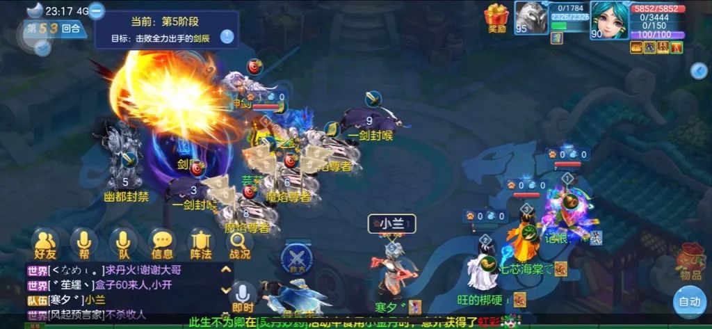 这绝对是值得被载入史册的战斗,从第四轮中期就开始炸,天崩开局的第五轮,到最后的4刀扫死Boss!!!感谢队友,感谢指挥!!!(我录屏了哈哈) 打到53回合,队伍的资源几乎消耗殆尽,最后天策四扫结束战斗,隔着屏幕都感受到了少侠当时的战况多么胶着,佩服佩服。 杨康: