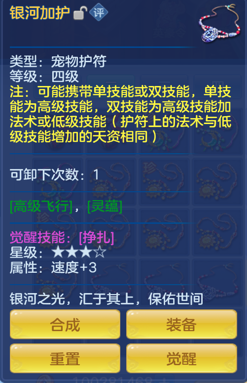 《神武4》手游战戒系统,目前已经优化迭代为宠物装备觉醒系统,鉴于许多小伙伴可能还不太了解,这里来简单为大家介绍一下。 问题解答: 问:之前弄了很久才成型的战戒,现在全没有了?技能需要重新弄了? 答:原有战戒会返还至少侠的战戒背包内,可通过战戒转化获得觉醒效果,比如原有战戒可组合出驰援技能,转化为觉醒效果后也激活驰援技能。 问:以前仓库里存的宠物装备是否能够觉醒? 答:可以,少侠原有的宠物装备可通过战戒转化赋予觉醒效果,或通过重置觉醒消耗一定的觉醒材料镀灵尘使宠物装备获得觉醒效果。 问:改的越来越复杂了,这个宠物装备觉醒系统又是怎么理解,很多人玩游戏只是利用碎片时间玩玩,没那时间去研究 答:宠物装备觉醒系统是在原有战戒系统上进行的迭代,觉醒技能为原有的战戒技能,少侠进入游戏使用一下基本能够了解了;新增的觉醒特效可以理解为人物装备的特效,让宠物战斗有更丰富的体验。 1、战戒转化介绍 1)战戒将全部卸下返还至战戒背包,战戒积分和战戒制造书转换为镀灵尘,可在宠装的觉醒界面查看。 2)战戒可转化为觉醒效果附着在宠物装备上:技能自选,星级不变,资质按比例转化为同类型属性,转化时有概率额外获得特效。 3)战戒转化有一定时限,请在时限内转化完毕,剩余战戒将自动转为相应价值的镀灵尘。 温馨提醒,少侠们虽然可以重新搭配战戒技能,但只能指定唯一技能,所以各位少侠转化觉醒时一定要慎重选择! 操作指南: 比如原先有一只【挣扎】宠物,战戒返还至背包后,无忧还想给它觉醒【挣扎】这一技能。 1)选择自己想要的技能-挣扎 2)筛选技能后可选择战戒,注意战戒星级转化为觉醒星级影响技能强度和效果,战戒资质转化为同类型的属性,少侠视宠物情况选择不同战戒进行转化。 3)觉醒系统只需要两件以上宠物装备觉醒技能相同且满足星级条件即可激活技能,当然三件装备可凑出更高星级获得更强的技能效果,这样一个拥有【挣扎】技能的宠物就再次完成了,多余的战戒也可以进行回收获得镀灵尘。 需要注意的是,战戒转化的有效期为60天,到期后战戒将会转化为镀灵尘。 2、重置觉醒介绍 在维护之前: 各位少侠已拥有的宠物装备无觉醒效果和免费重置次数 在维护后至宠物装备觉醒系统开放期间: 各位少侠获得的宠物装备会在觉醒系统开放之后,拥有一次免费觉醒重置的机会。 在宠物装备觉醒系统开放之后: 各位少侠获得的宠物装备会拥有随机的觉醒技能、星级、属性 当【宠物项圈】+【宠物装甲】+【宠物护符】三个部位中,有两件以上觉醒技能相同且满足星级条件时即可激活,且星级越高,觉醒技能效果越好。 那么问题来了!这个宠物装备上的觉醒技能效果能不能重置? 不管是已使用的宠物装备还是未使用的宠物装备都可以进行觉醒。 随机挑选一个宠物装备作为展示,点击觉醒按钮,进入觉醒界面。 觉醒界面中包含选择装备,选择觉醒技能,当前属性和重置属性,使用过程有点类似“造化炉套装材料重置”、“九州谱奇珍重置”。 觉醒后会获得随机的技能、星级、属性和特效,其中属性较高的是黄色字表示,特效比较稀有,为紫色字表示。 另外,重置觉醒效果时,技能会从选择的阶数中随机获取。 宠物装备等级越高,战戒资质转化的属性也会越高,如四级的南明离火与三级的蛮兽之角相比。 3、觉醒重置消耗介绍 1)重置技能需消耗【镀灵尘】,另外每日可进行20次银币重置,20次以上需消耗金币,次数过多价格会上涨。 2)重置技能阶级相同时,觉醒的宠物装备等级越高,消耗的银币越高。 3)重置宠物装备等级相同时,觉醒的技能阶级越高,消耗的银币越高。 另外,无忧也有一个小建议,少侠如果战戒与重置资源并不充足的话,可以优先组合觉醒技能,然后再追求觉醒特效。 以上就是无忧带来的战戒迭代宠物装备觉醒介绍,希望对各位少侠能有所帮助。 扫一扫以下《幻唐志手游》二维码,根据自己的手机(安卓版、IOS版),下载对应的幻唐志手游客户端!赶紧邀请小伙伴,一起畅玩游戏! [编辑:ssc]