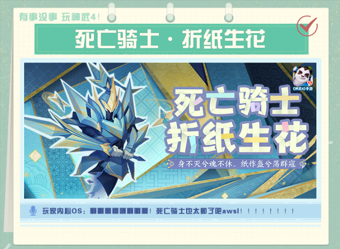 《神武4》手游对于昨天爆料的新皮肤,有许多小伙伴都猜对了,第一个皮肤原型正是死亡骑士。官方爆料了死亡骑士折纸皮肤的详细资料,一起来看看吧! 死亡骑士的皮肤也太帅了!胖子胖子,新皮肤什么时候上线呀!3月18号上线,届时就能与各位少侠见面啦! 扫一扫以下《幻唐志手游》二维码,根据自己的手机(安卓版、IOS版),下载对应的幻唐志手游客户端!赶紧邀请小伙伴,一起畅玩游戏! [编辑:ssc]