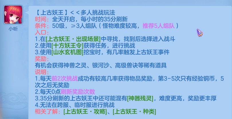 上古妖王是大家最初碰到的较为有难度的挑战,在人物50级时开启,完成挑战后可获取神兽之灵、银河沙、高级兽决等丰富奖励。 在游戏中,上古妖王在每个整点35分刷新一次,随机出现在三个地图场景中,在线人数越多,妖王刷新的数量越多。 此外,还可以使用十方妖王令(商城购买/日常掉落)挑战,山水玄机图挖宝时也有几率触发该事件。上古妖王强悍,≤3人方可挑战,大家别忘了邀请好友组队哦。下面就让我们进入攻略正餐~ Part 1 妖王族谱 在了解完上古妖王的基本挑战情况之后我们接下来进入“妖王”的解析。上古妖王共有12位,按照系别种类来分有物、法、封、辅四个大类。种类不同,所以技能也各不相同,他们会携带一些小怪出现在大家面前。 物理妖王: 帝江,句芒——技能为天策或者万兽门派技能,概率释放特技嗜血连击,破魔斩,蓄力一击 蓐收——技能为天策或者天宫或者万兽门派技能,概率释放特技嗜血连击 法系妖王: 共工,祝融,烛九阴——均为龙宫或者魔王门派技能,概率会使用特技烽火连城 封系妖王: 强良,天吴,奢比尸——技能皆为方寸或者盘丝门派技能,回合初必定触发天火焚心 辅助妖王: 玄冥,龠(yue)兹——技能为佛门或者普陀门派技能,概率使用冥王斩 后土——技能为佛门门派技能,概率使用冥王斩 物理小怪 妖城悍将;妖尸;先锋妖(有连击和感知技能);力大无穷(人如其名,物理高伤), 裂甲(破碎之锤,物理高伤);撕天(连击、追击、残血使用后发) 法系小怪 妖城法师;迷离;魔焰冲天(法术高爆击);翻江(法术高爆及) 封系小怪 神封无量;魅心妖(速度低但封印命中率极高) 辅助系小怪 妖城祭祀;解烦 在看到上面这些图和讲解之后相信大家已经和妖王混了个脸熟,对他们的技能也有了初步了解,在之后的挑战中,看到不同的妖王也能分辨它是属于什么系别种类的了。 Part 2 队伍组建&阵法选择 队伍:在挑战上古妖王时,我们不能和平时做普通任务一样随意组建队伍(除非你想“挨揍”),要选择以攻为主,攻守兼备的队伍体系。这里为大家推荐“一封,一辅,三输出”的队伍搭配,选择携带单攻宠物,提高点杀能力,快速清掉具有威胁的小怪。 阵法:在这里为大家推荐的阵法是风扬、虎翼、地载三阵,搭配宠物后分别在速度、减伤、加攻击方面有加持,同时在遭遇妖王队伍时这三类阵法也极少遇到被“阵法大克”的情况(减少翻车概率)。 Part3 打法详解 上文已经提到过妖王分四类,那么每一类的妖王阵容也自然不同,下面就为大家讲解针对不同种类的妖王阵容我们应该选择的不同打法。 物理妖王阵容打法 阵容一:妖王*1+魔焰冲天*3+舍命*2+妖城祭祀*1 打法:封印魔焰冲天两个,全部集火主怪,第一回合基本死或者打残,第二回合补刀开始集火魔焰冲天,后续封印舍身即可,然后逐步集火清理就能通关。还有另一种打法是首先击杀点杀能力较强的舍命,封印另外一个舍命,再杀掉它。然后集火主怪,最后只需要指挥集火同一只怪物就可以轻松通关了。两种打法根据自身队伍配置选择。 阵容二:妖王*1+迷离*3+舍命*1 打法:不要看阵容觉得怪很少!主怪会使用召唤技能,召唤出3个相同能力和造型的小怪。我们选择首先杀死1个迷离,杀死1个迷离之后开始杀主怪,不然主怪可能会在小怪少的时候继续召唤分身。期间封系全程封印另外2个迷离。主怪死后也不能封两个以上的单位,分身同样可以使用特技群体净心。然后清理分身再逐步清理小怪即可。 阵容三:妖王*1+力大无穷*2+妖城法师*2+妖城悍将*2+魅心妖*1 打法:??第一回合集火杀死魅心妖,输出能力强的话基本1回合就能杀死来。不行就第二回合开始补一个平A,封系优先封印力大无穷。魅心妖死后杀力大无穷。2个力大无穷都死后再杀主怪,最后慢慢清理小怪即可。 法系妖王阵容打法 阵容一:妖王*1+妖城法师*2+妖城悍将*2+神封无量*1+解烦*1 打法:封系封印神封无量,全部人集火主怪,主怪死后杀神封无量,封印其他小怪。优先封物理小怪,其次封印法系小怪,最后慢慢清理小怪即可。 阵容二:妖王*1+妖城悍将*4+先锋妖*1+妖城祭祀*1 打法:封系封印2个妖城悍将,杀另外2个妖城悍将,再杀主。先锋妖很弱,输出不高。主死之后在顺序杀掉其他小怪即可。 封系妖王阵容打法 阵容一:妖王*1+撕天*4+妖城法师*2 打法:直接杀主,封印撕天,因为撕天会物理连击和以守为攻,以守为攻点杀能力过强,会抽奖掉人。封系玩家主死后无脑封印,有多少封多少即可。全部撕天死完之后,最后杀掉妖城法师。 阵容二:妖王*1+妖城法师*2+魔焰冲天*2+妖城悍将*2 打法:开始直接杀主,全程封印妖城法师,主死后去杀妖城悍将,再杀掉剩余的妖城法师最后杀魔焰冲天即可。 阵容三:妖王*1+妖城法师*2+妖城悍将*2力大无穷*2妖城祭祀*1 打法:开始直接杀主,封印力大无穷。主死之后开始杀力大无穷,封妖城悍将,再杀掉剩余妖城法师,最后杀掉祭祀就行了。 辅助系妖王阵容打法 阵容一:妖王*1+魅心妖*1+翻江*3+裂甲*3; 打法:先杀魅心妖,避免被封,封印翻江,杀死2个翻江后,再去杀裂甲。裂甲死后会被主怪复活,法系玩家记得守尸(利用法师的尾速伤害,守住对面死亡目标拉起,不让其复活),最后杀主怪。 阵容二:妖王*1+魅心妖*1+妖尸*3+魔焰冲天*3 打法:先杀魅心妖,避免被封,封印妖尸,杀魔焰冲天,3个魔焰冲天都死掉之后开始杀妖尸,妖尸死后也是会被主怪复活的,法系玩家记得守尸,杀完全