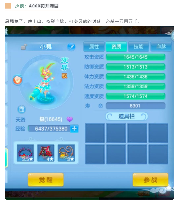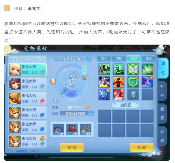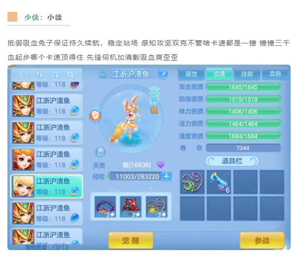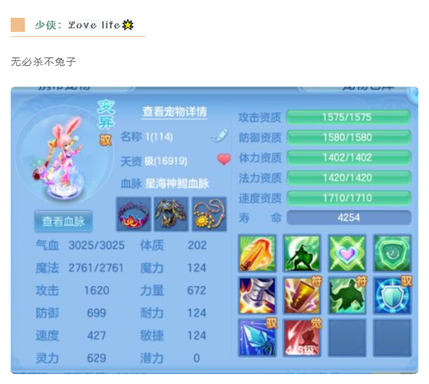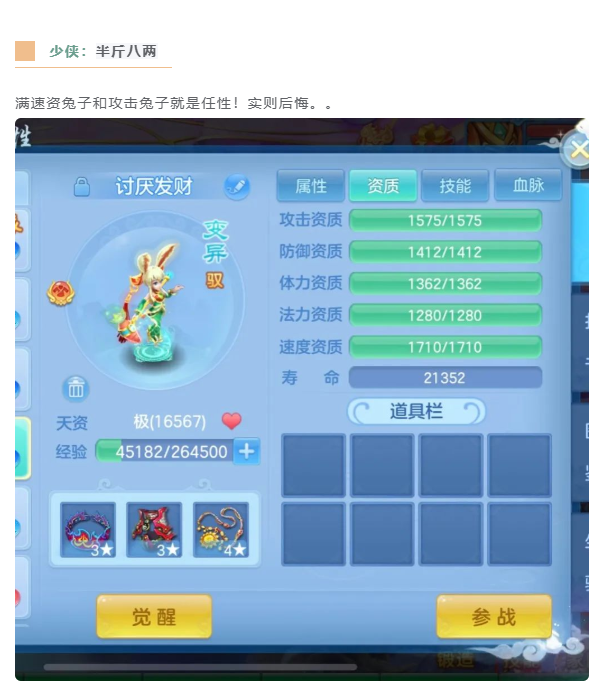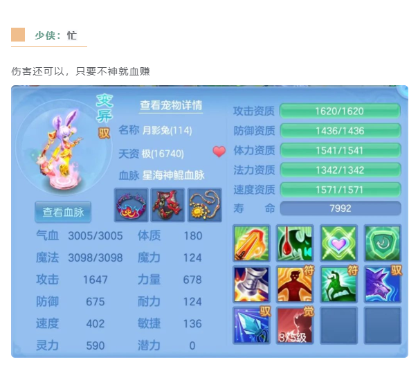 《神武4》手游前几天征集了“月影兔”的打书,接下来就来看看大家的打书方案吧~ 少侠:AKIHI 月影兔保命吸血抵御加强生存,攻坚感知作为克制技能,打夜战考虑不受夜间影响,亮点是清剿!锤卡速、法宠,非常好用。 大多人会选择将月影兔打造为伺机清剿克制宠,也会选择打上高抵御降低受到的伤害结果来提高生存,配合高吸血提高续航力,当然也有暴力的高敏高必月影兔,其它少侠若是不知怎么打造,也可以参考一下~ 扫一扫以下《幻唐志手游》二维码,根据自己的手机(安卓版、IOS版),下载对应的幻唐志手游客户端!赶紧邀请小伙伴,一起畅玩游戏! [编辑:ssc]